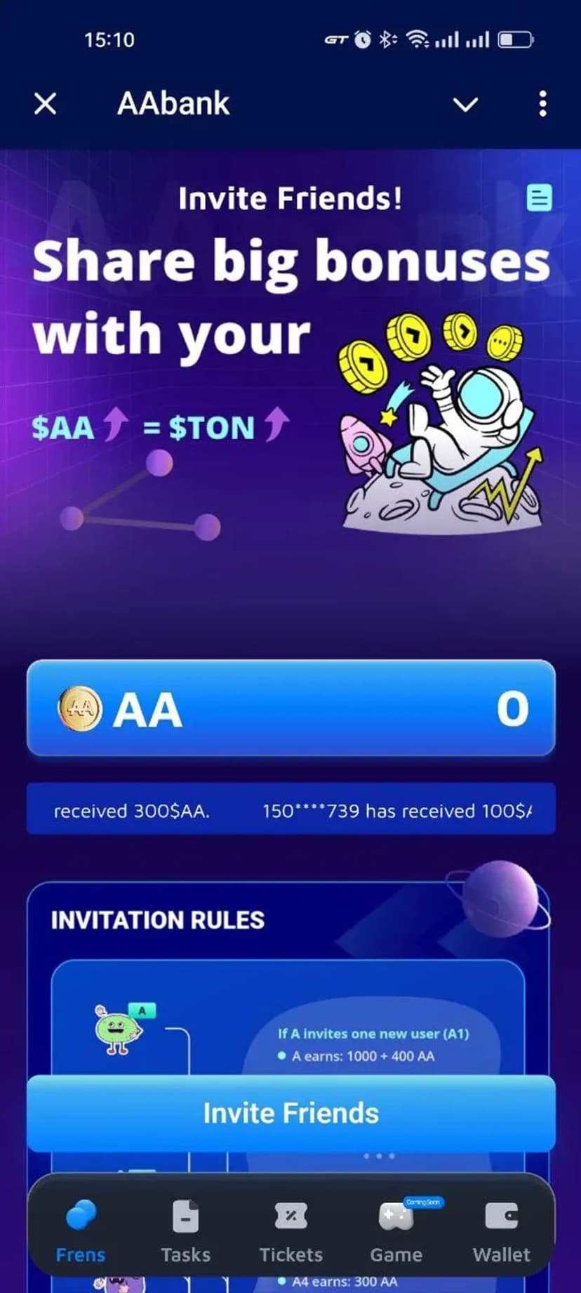 - Заработок: получение вознаграждений в $TON и собственном токене $AA за выполнение заданий и участие в реферальной программе.
