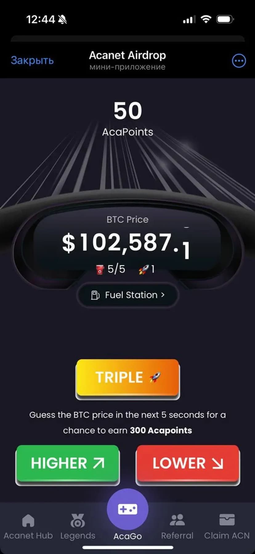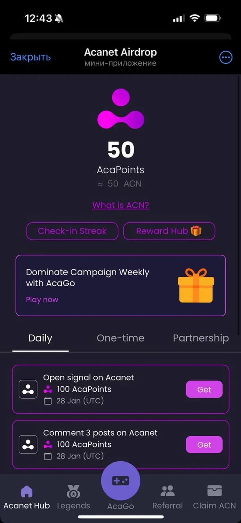 Acanet Airdrop — мини‑программа для привлечения пользователей в финансовую социальную сеть Acanet. Сервис награждает внутриигровыми токенами за выполнение обучающих заданий и просмотр контента, фиксируя прогресс по Telegram‑аккаунту и отображая его на главном экране.