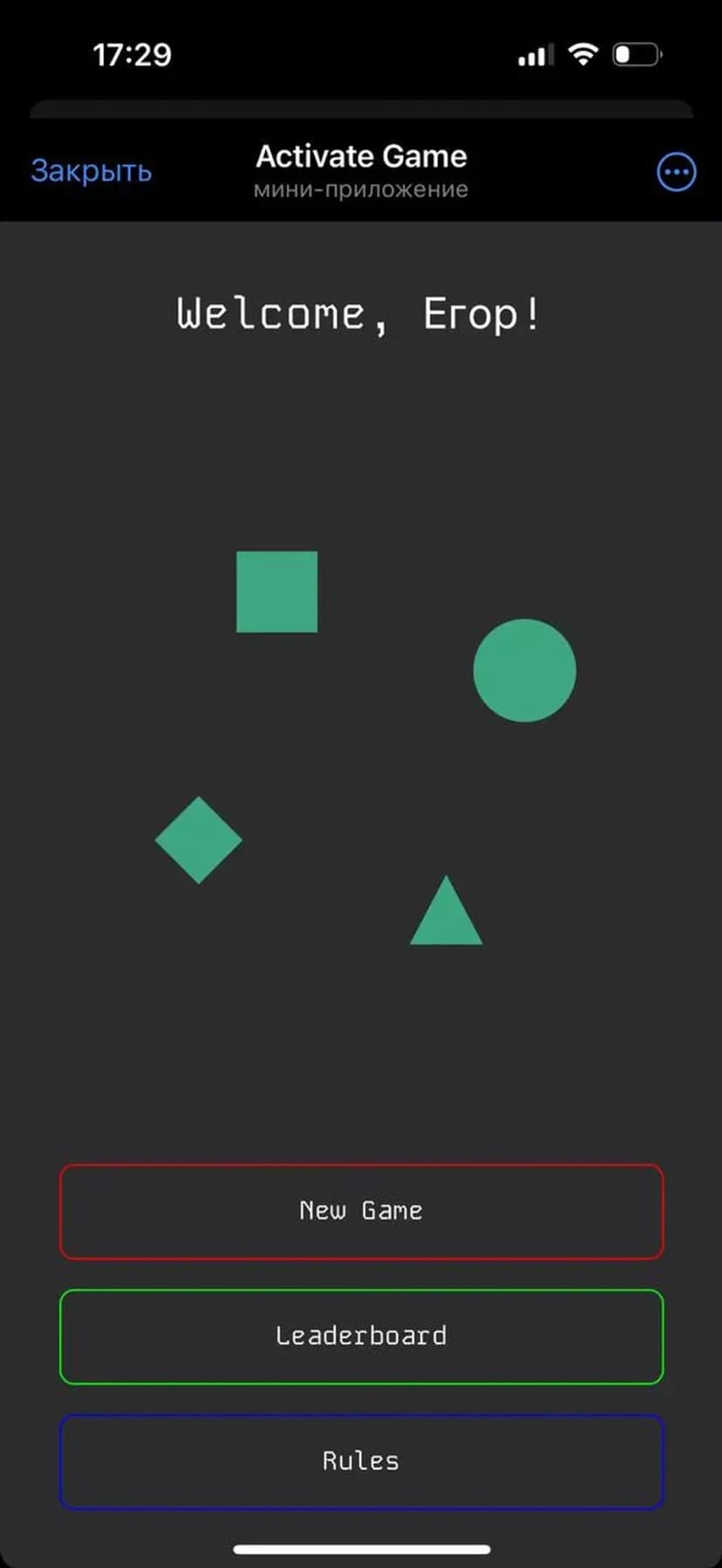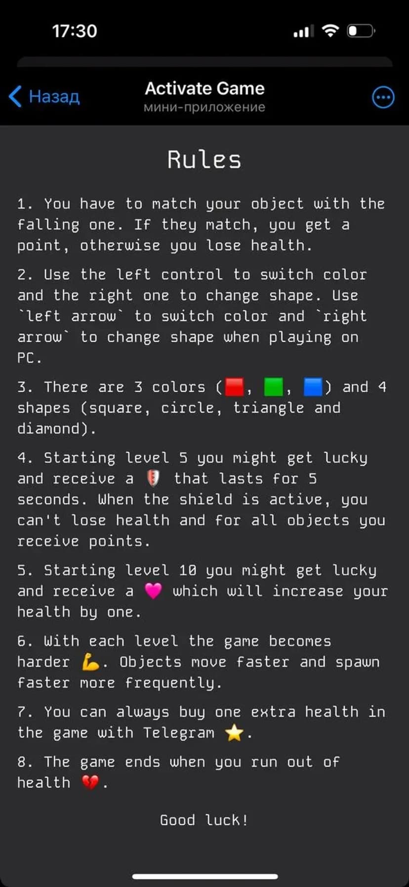 Activate — динамичная мини‑игра в Telegram: на экране появляются падающие объекты, которые нужно быстро сопоставлять по заданному принципу до того, как они достигнут нижней границы.