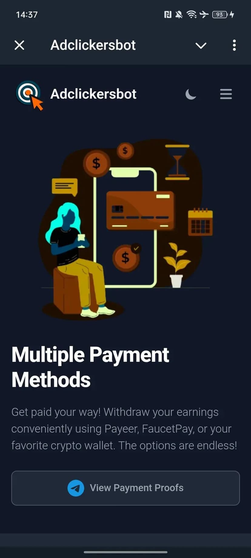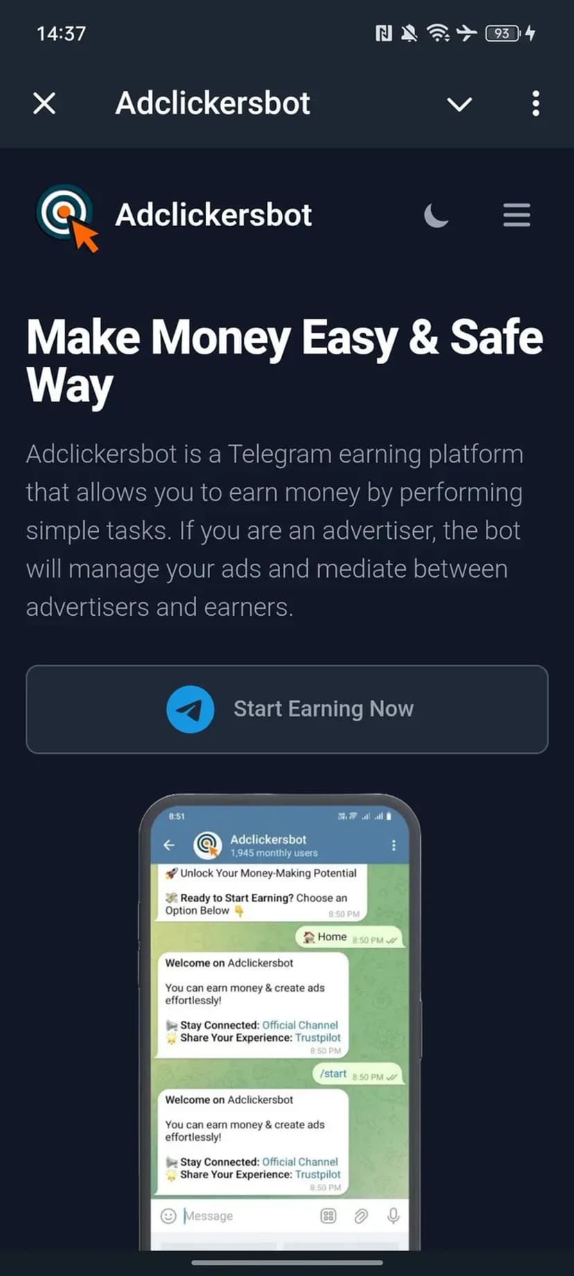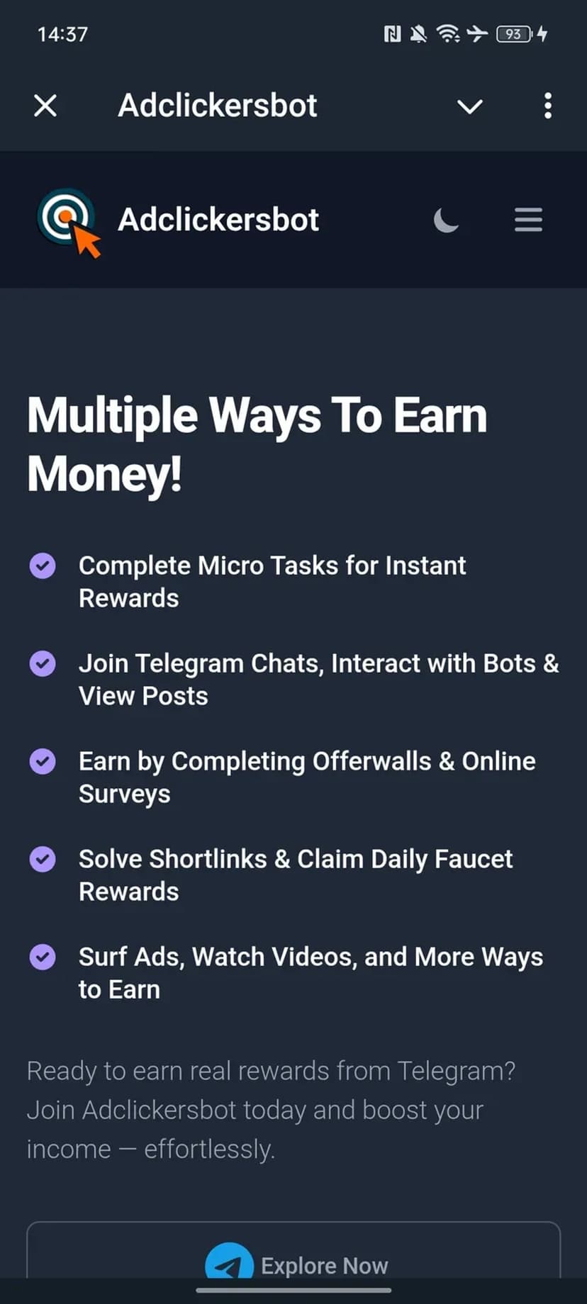 Adclickersbot — бот в Telegram для заработка на простых заданиях. Пользователь получает список доступных заданий (просмотр рекламы, переходы по ссылкам, подписки на каналы) и получает вознаграждение за каждое подтверждённое действие. Управление осуществляется через стандартный интерфейс Telegram.