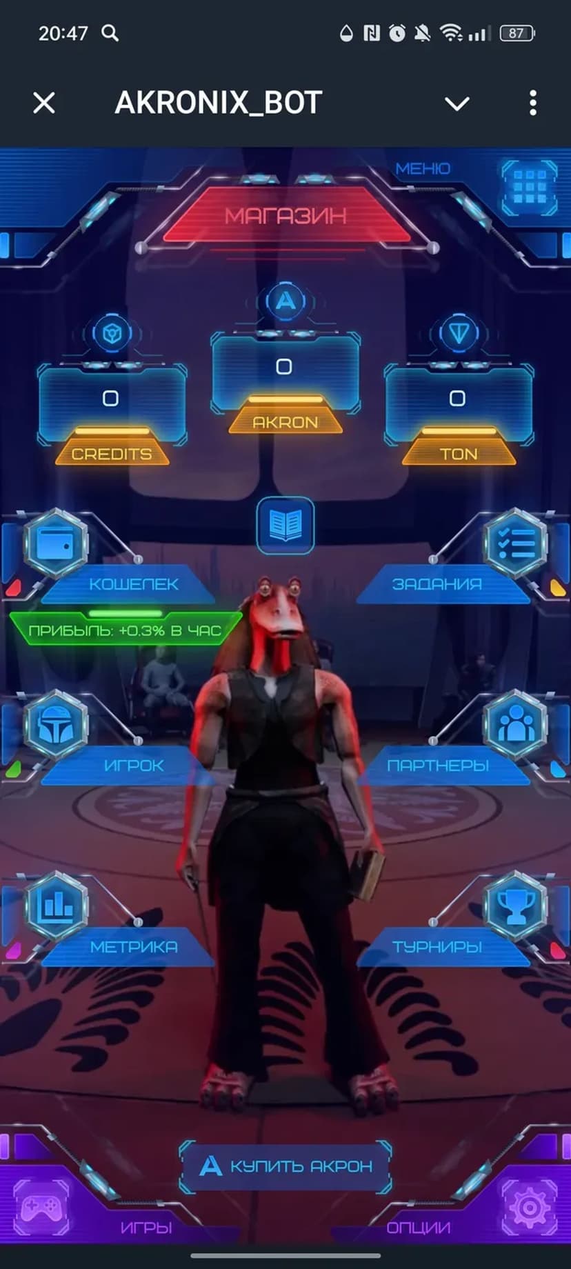 AKRONIX_BOT — мини‑приложение в Telegram для NFT‑игр с P2E‑механиками. Пользователи выполняют задания, участвуют в турнирах и развивают коллекцию NFT‑героев, получая внутриигровую валюту и бонусы без выхода из чата.