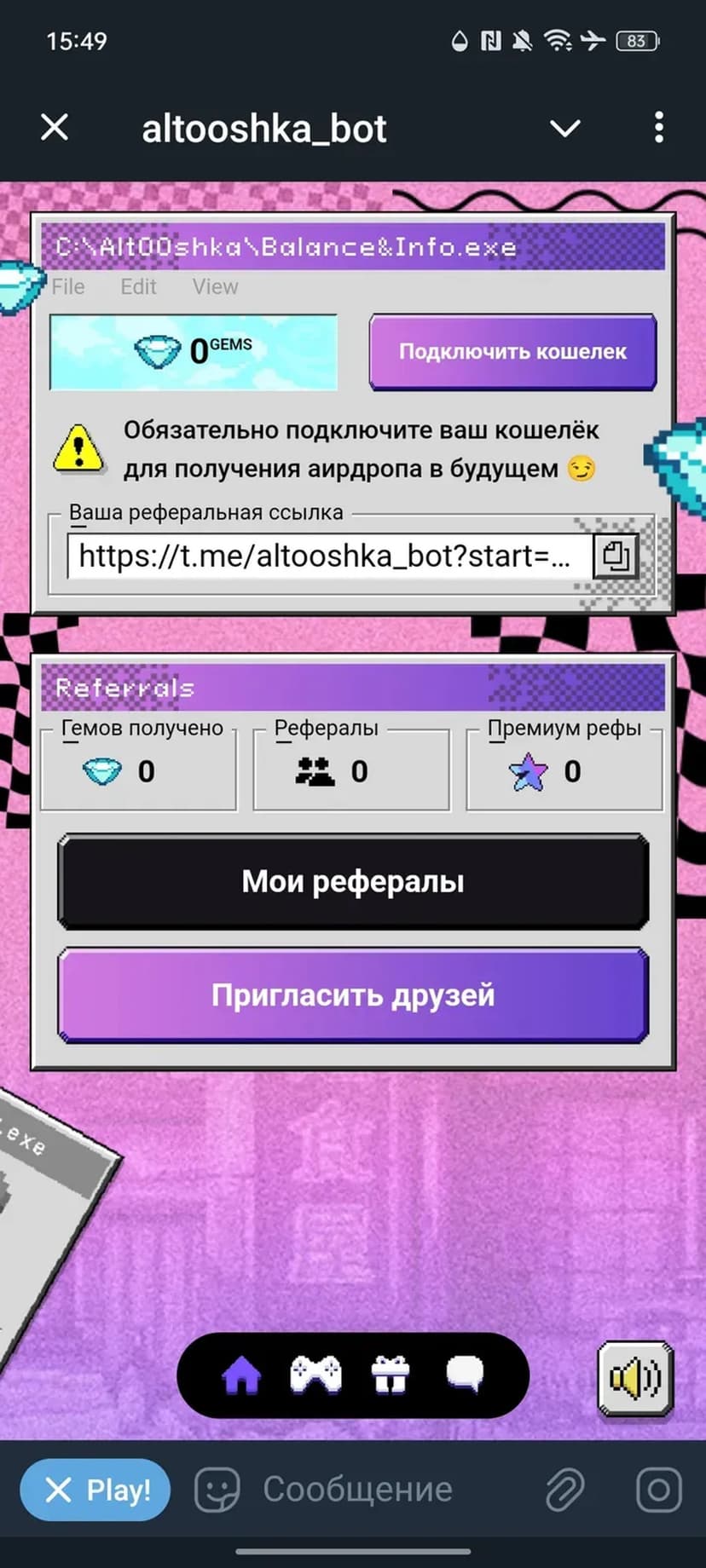 altooshka_bot — тамагочи‑стильный виртуальный питомец с механикой Play-to-Earn. Пользователи заботятся об альтушке — кормят её, общаются, выполняют задания и приглашают друзей, за что получают внутриигровые очки GEMS. Накопленные GEMS впоследствии можно обменять на токены $ALT, связанные с TON‑экосистемой.