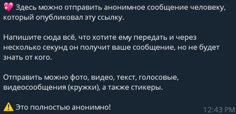 Инструмент эффективен как в личном общении, так и в публичных каналах: подписчики могут анонимно направлять вопросы или отклики администраторам и друг другу.