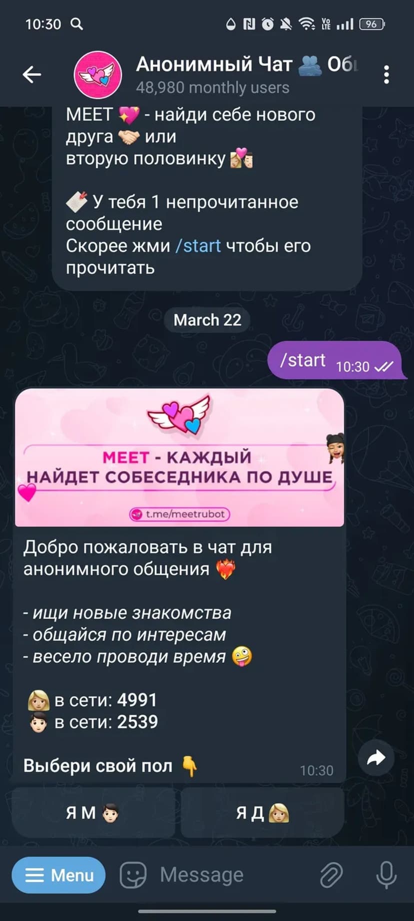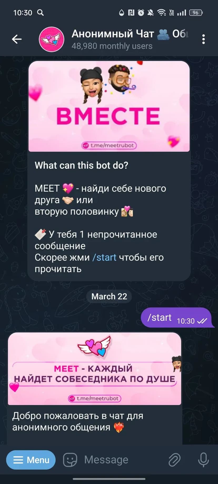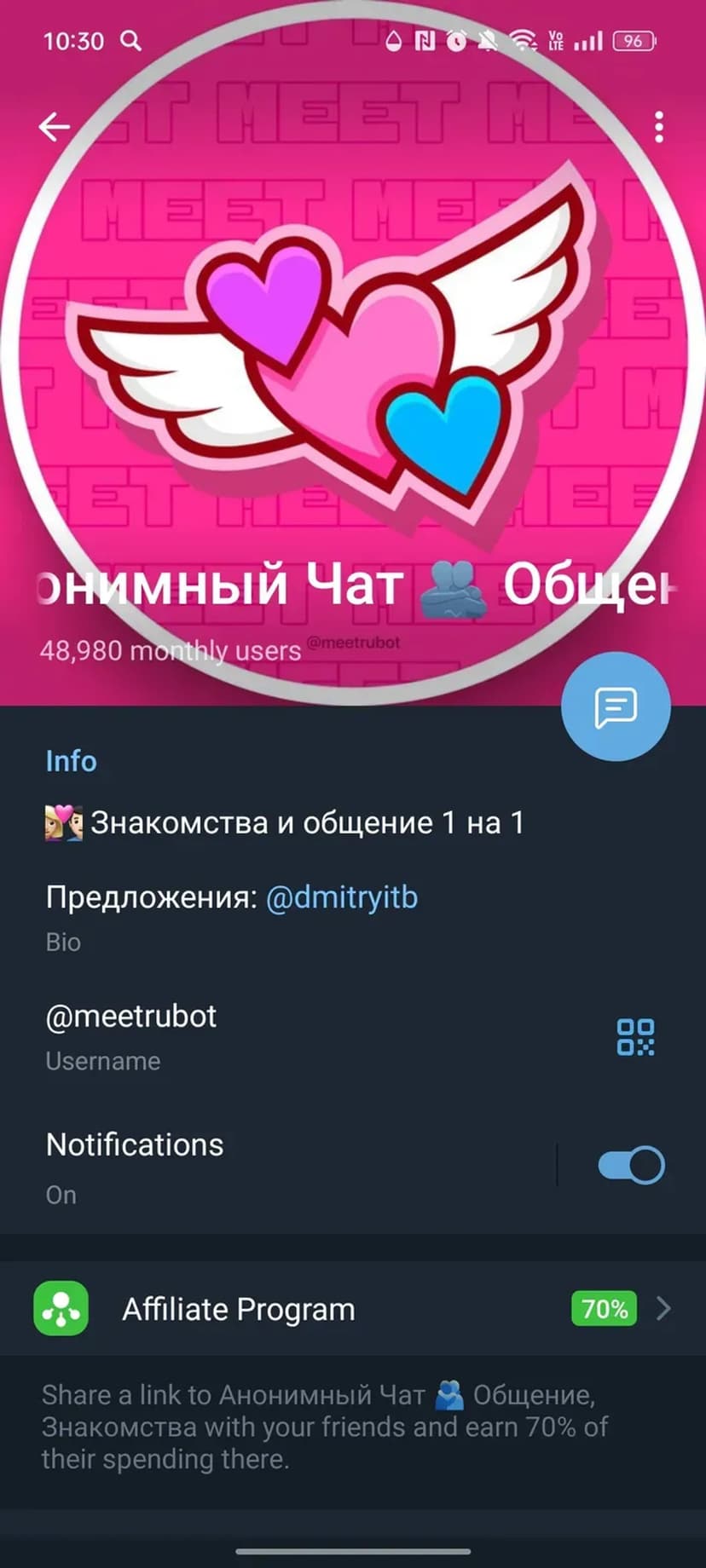 *Нажимая "Открыть в Telegram", вы перейдете к приложению Анонимный Чат ❤️ Общение, Знакомства в мессенджере Telegram