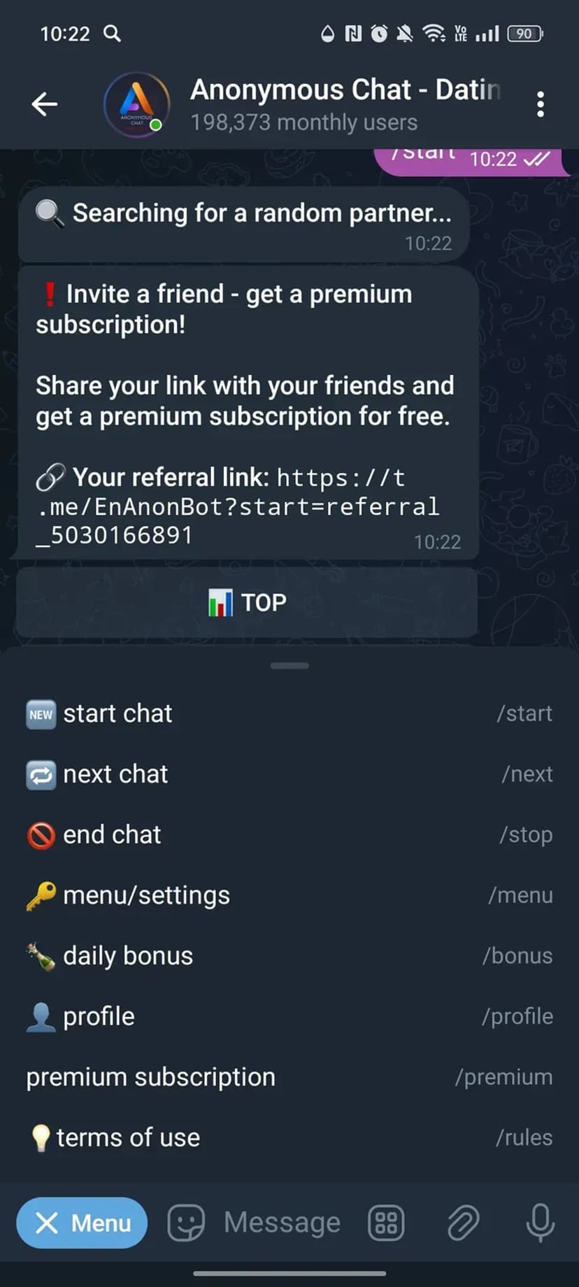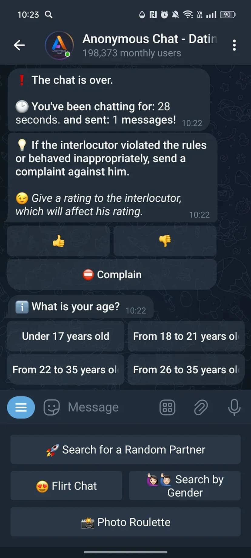 Anonymous Chat - Dating — анонимный сервис в Telegram, автоматически соединяющий двух случайных пользователей для приватного общения. Не требуется создание профиля и раскрытие личных данных.