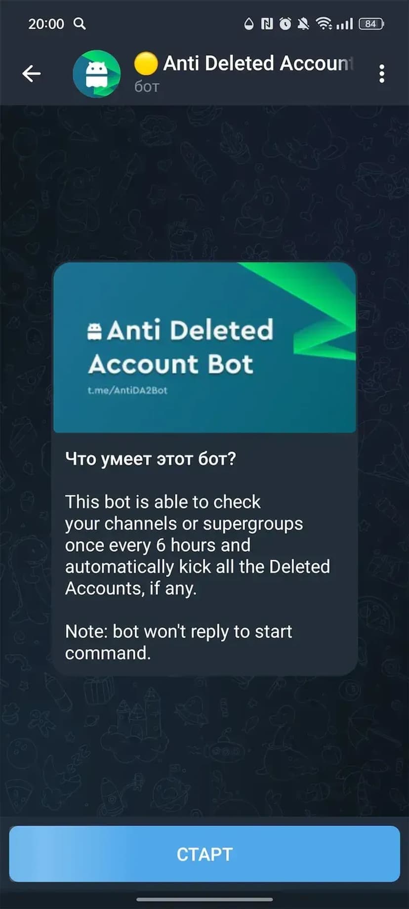 π‘ Anti Deleted Accounts Β² Π°Π²ΡΠΎΠΌΠ°ΡΠΈΡΠ΅ΡΠΊΠΈ Π½Π°Ρ ΠΎΠ΄ΠΈΡ ΠΈ ΡΠ΄Π°Π»ΡΠ΅Ρ ΡΠ΄Π°Π»ΡΠ½Π½ΡΠ΅ Π°ΠΊΠΊΠ°ΡΠ½ΡΡ Π² ΠΊΠ°Π½Π°Π»Π°Ρ ΠΈ ΡΡΠΏΠ΅ΡΠ³ΡΡΠΏΠΏΠ°Ρ . ΠΠΎΡΠ»Π΅ Π΄ΠΎΠ±Π°Π²Π»Π΅Π½ΠΈΡ Π±ΠΎΡΠ° Ρ ΠΏΡΠ°Π²Π°ΠΌΠΈ Π°Π΄ΠΌΠΈΠ½ΠΈΡΡΡΠ°ΡΠΎΡΠ° ΠΎΠ½ Π½Π°ΡΠΈΠ½Π°Π΅Ρ ΡΠ°Π±ΠΎΡΡ Π±Π΅Π· Π΄ΠΎΠΏΠΎΠ»Π½ΠΈΡΠ΅Π»ΡΠ½ΡΡ Π½Π°ΡΡΡΠΎΠ΅ΠΊ ΠΈ ΡΡΡΠ½ΠΎΠΉ ΠΌΠΎΠ΄Π΅ΡΠ°ΡΠΈΠΈ, ΠΏΠΎΠ΄Π΄Π΅ΡΠΆΠΈΠ²Π°Ρ Π°ΠΊΡΡΠ°Π»ΡΠ½ΡΡ Π±Π°Π·Ρ ΡΡΠ°ΡΡΠ½ΠΈΠΊΠΎΠ².