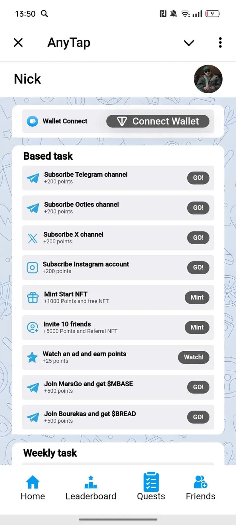 AnyTap помогает войти в экосистему TON через выполнение onchain‑задач и получение уникальных NFT в качестве вознаграждения. Каждое задание сопровождается пошаговыми подсказками, которые объясняют взаимодействие с блокчейном и знакомят с новыми коллекциями NFT.
