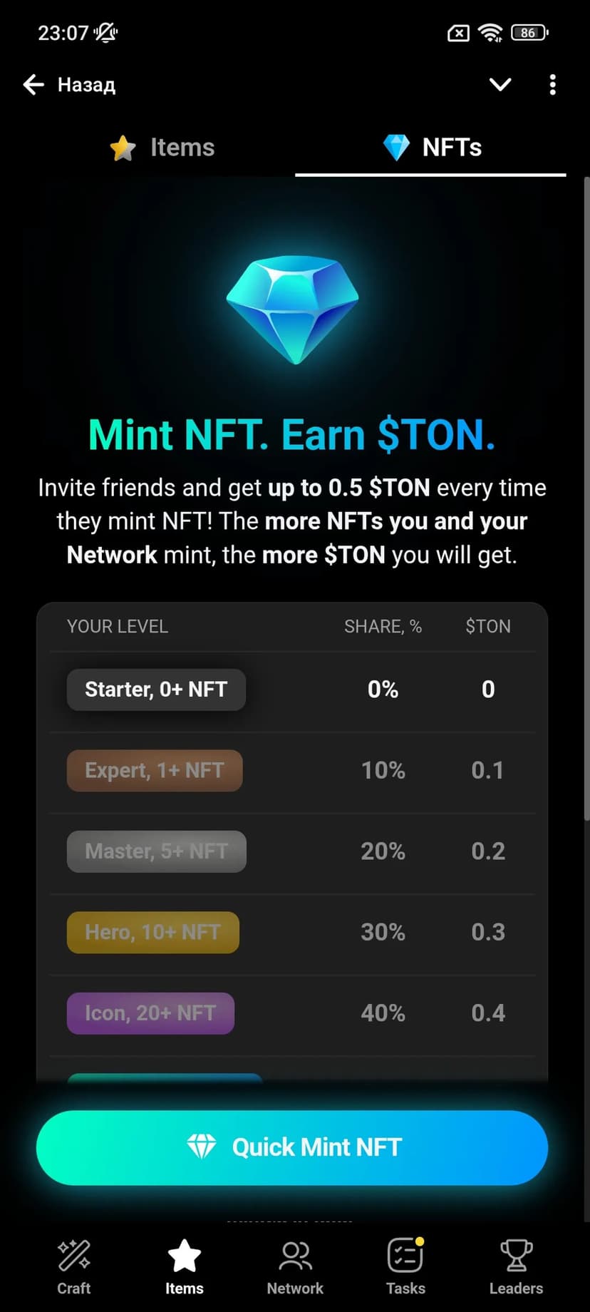 - Минтите редкие элементы в NFT — каждый NFT даёт ежедневный бустер для ускорения прогресса.