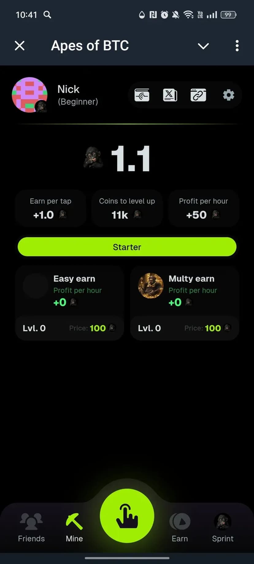 Apes of BTC — простая и увлекательная мини‑игра в Telegram, где за нажатия собирают внутриигровые монеты, повышают уровень персонажа и настраивают пассивный доход через апгрейды игровых карт.