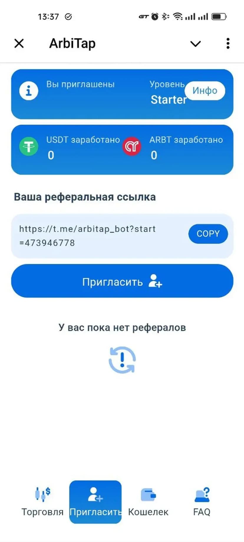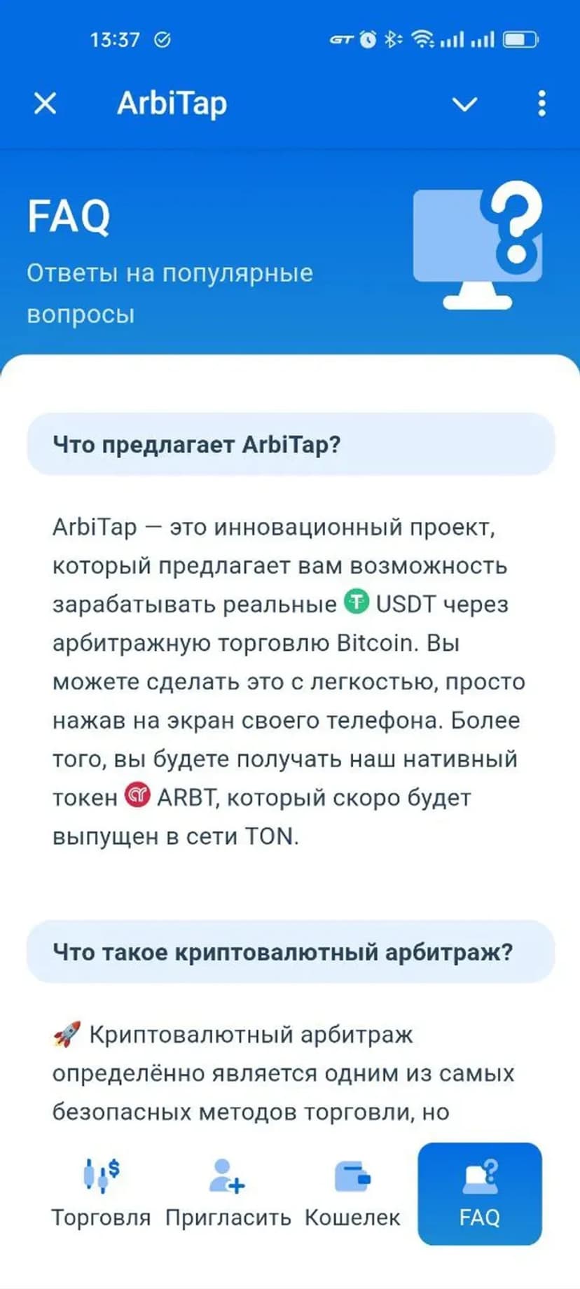 ArbiTap — Tap-to-Trade инструмент для арбитражной торговли криптовалютой внутри Telegram. Вход выполняется через Telegram-аккаунт без отдельной регистрации, что позволяет быстро приступить к операциям.
