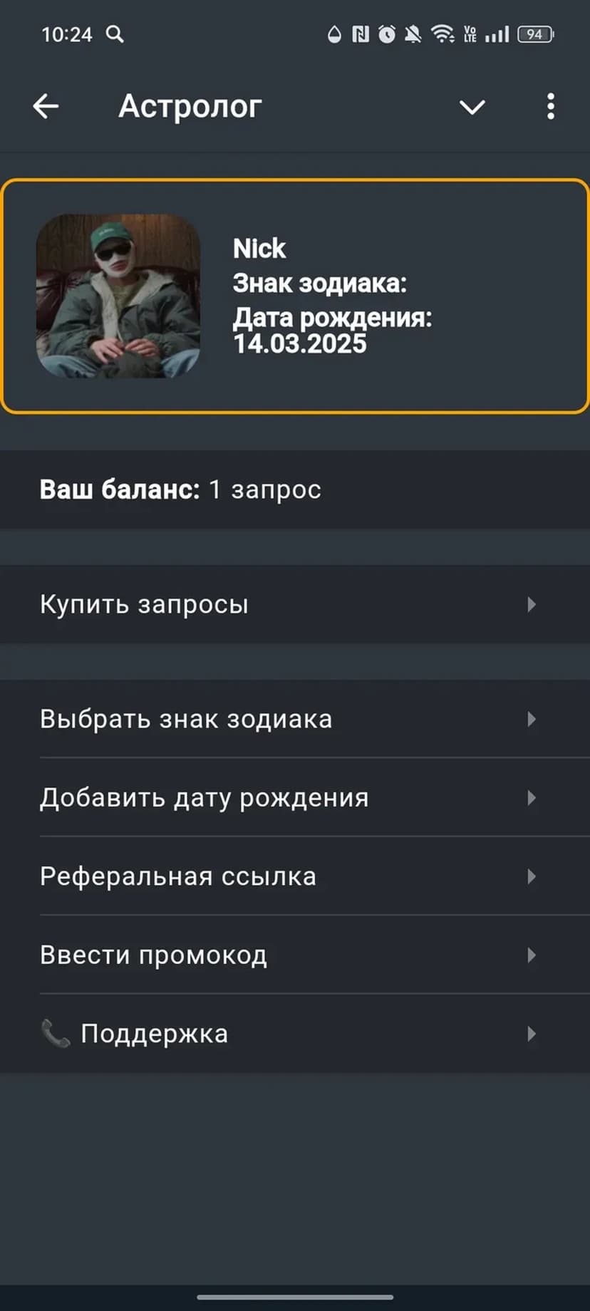 Астролог предлагает быстрый доступ к персональным гороскопам и кратким астрологическим объяснениям прямо в чате. Бот автоматически рассчитывает гороскоп по введённой дате рождения и даёт оценку влияния планет на текущие события.