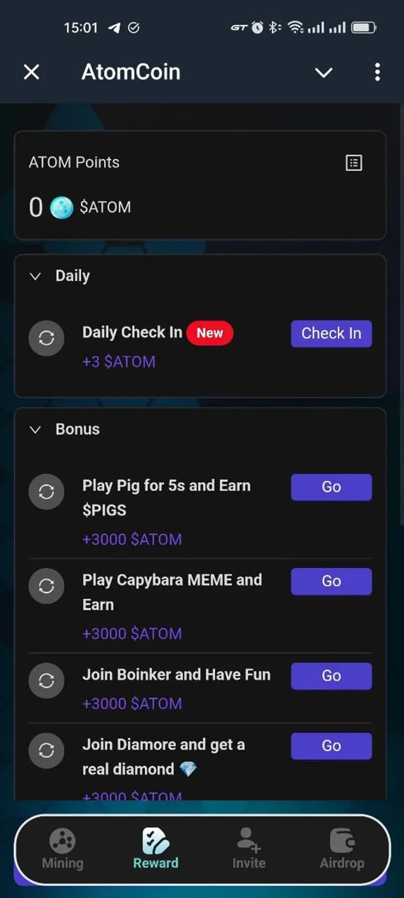 Зарабатывайте токены AtomCoin за публикации, приглашения и активность в чатах.