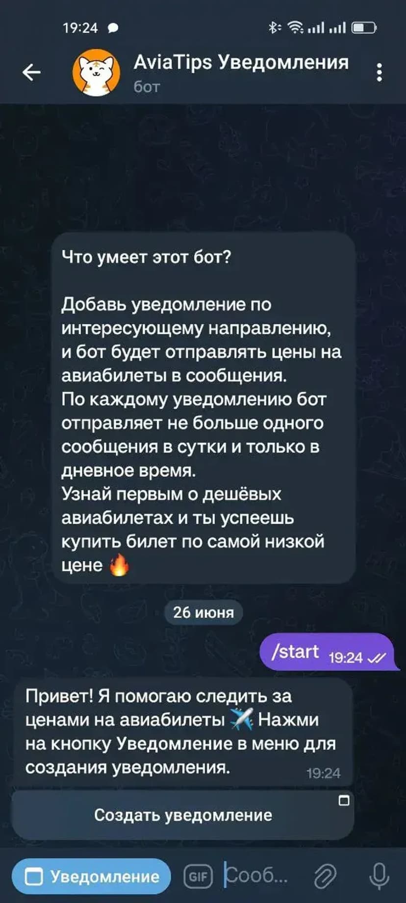 Отслеживает цены на авиабилеты и присылает дневные уведомления о выгодных предложениях