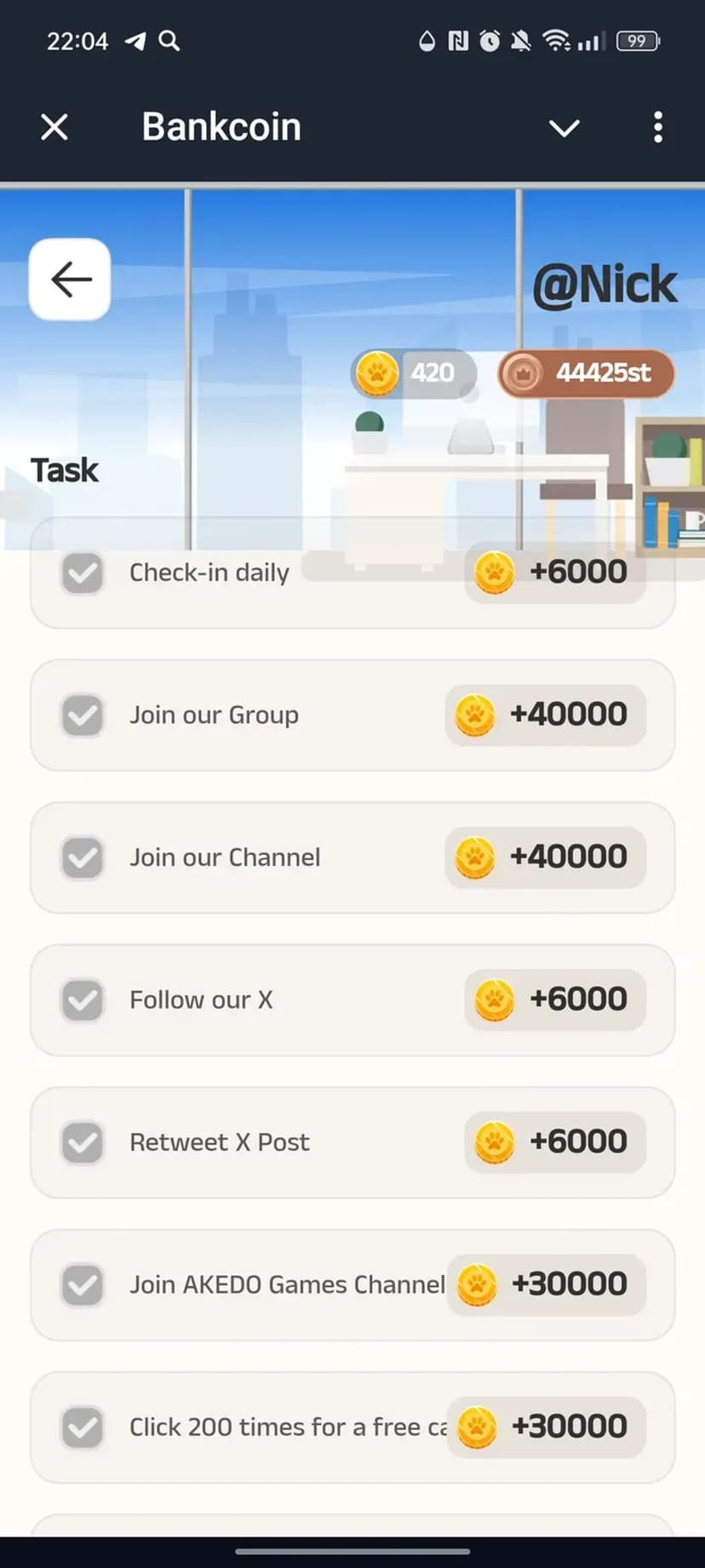 Пользователь регистрируется, создаёт собственный виртуальный банк и выполняет операции — пополнение, вывод и обмен валют. За успешные внутриигровые действия начисляются награды и внутренняя валюта, которые можно использовать в игровом процессе и для транзакций.