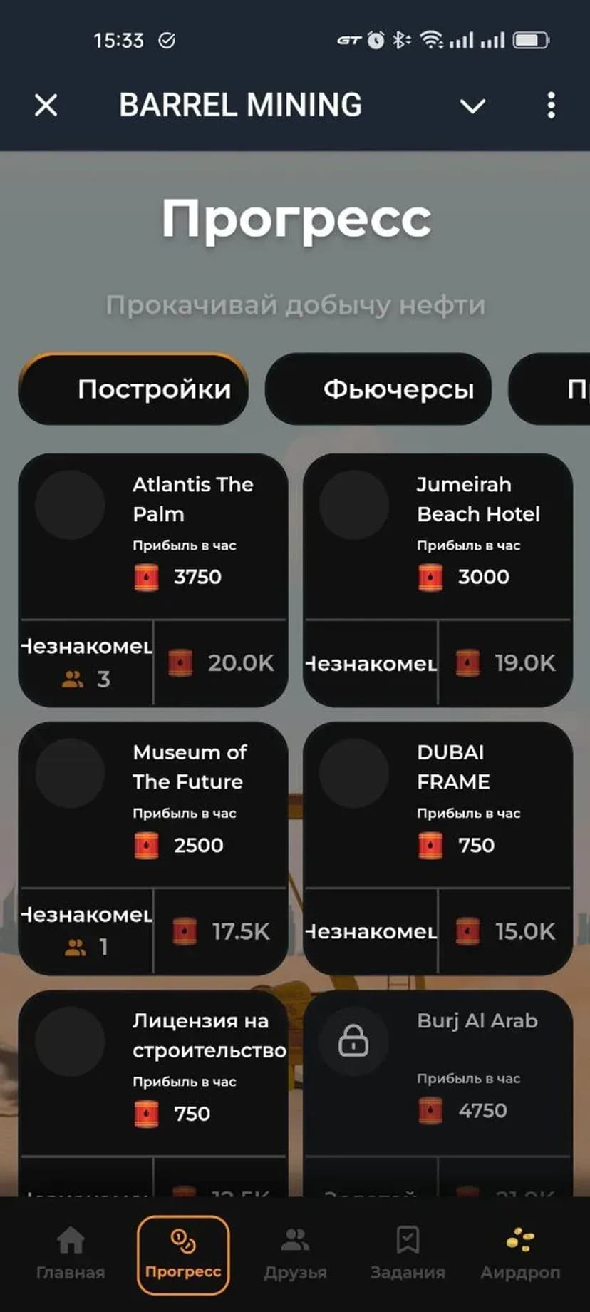 Заработанные BRRL можно тратить на строительство известных объектов Дубая; возведение зданий открывает новые уровни и дополнительные возможности в игре. Проект делает упор на сочетание добычи ресурсов и градостроительного развития.