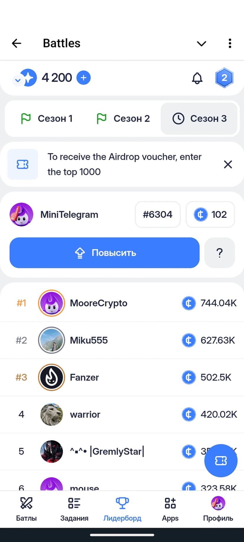 Таблица лидеров сбрасывается после каждого Airdrop, что даёт всем участникам равный старт.