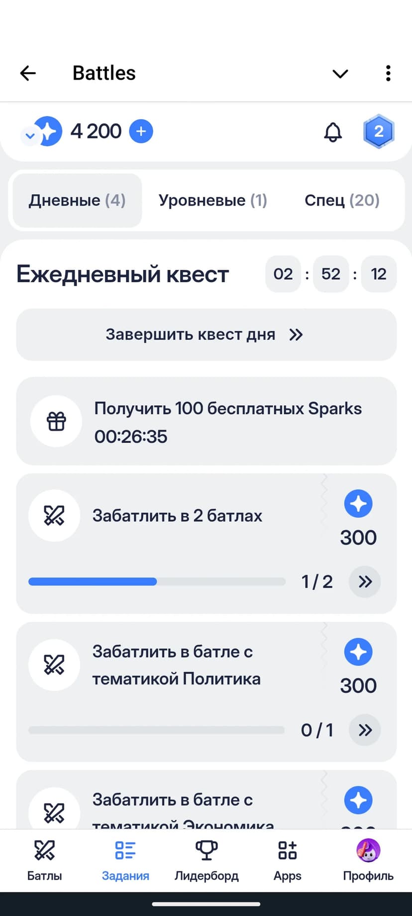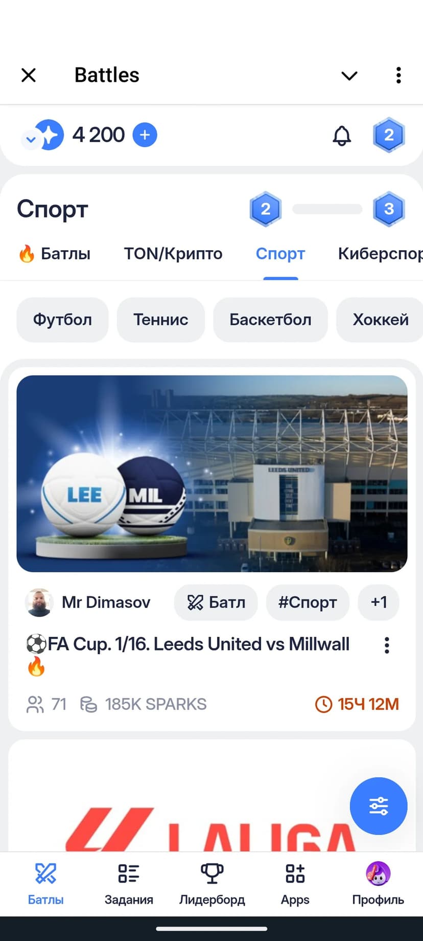 Battles — рынок прогнозов в Telegram: делайте ставки Sparks на спортивные матчи, движения криптовалют, мировые новости и киберспортивные турниры, получайте награды за точные прогнозы и накапливайте Credits.