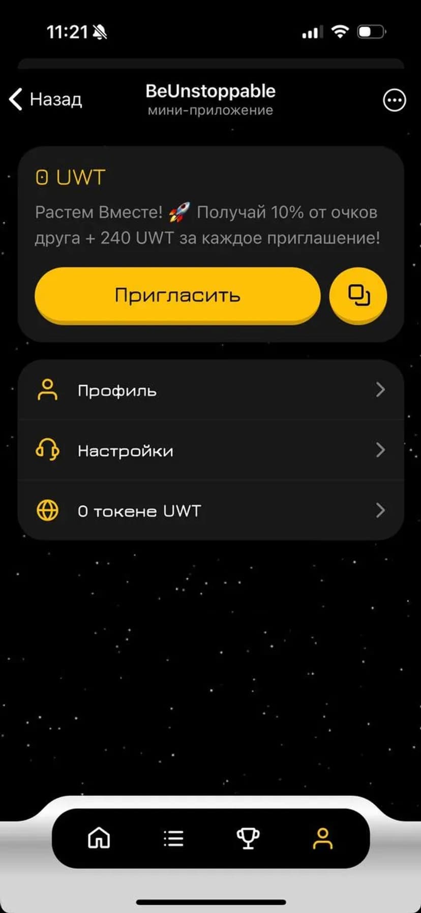 - Баланс токенов обновляется в профиле пользователя в реальном времени после прохождения этапов.