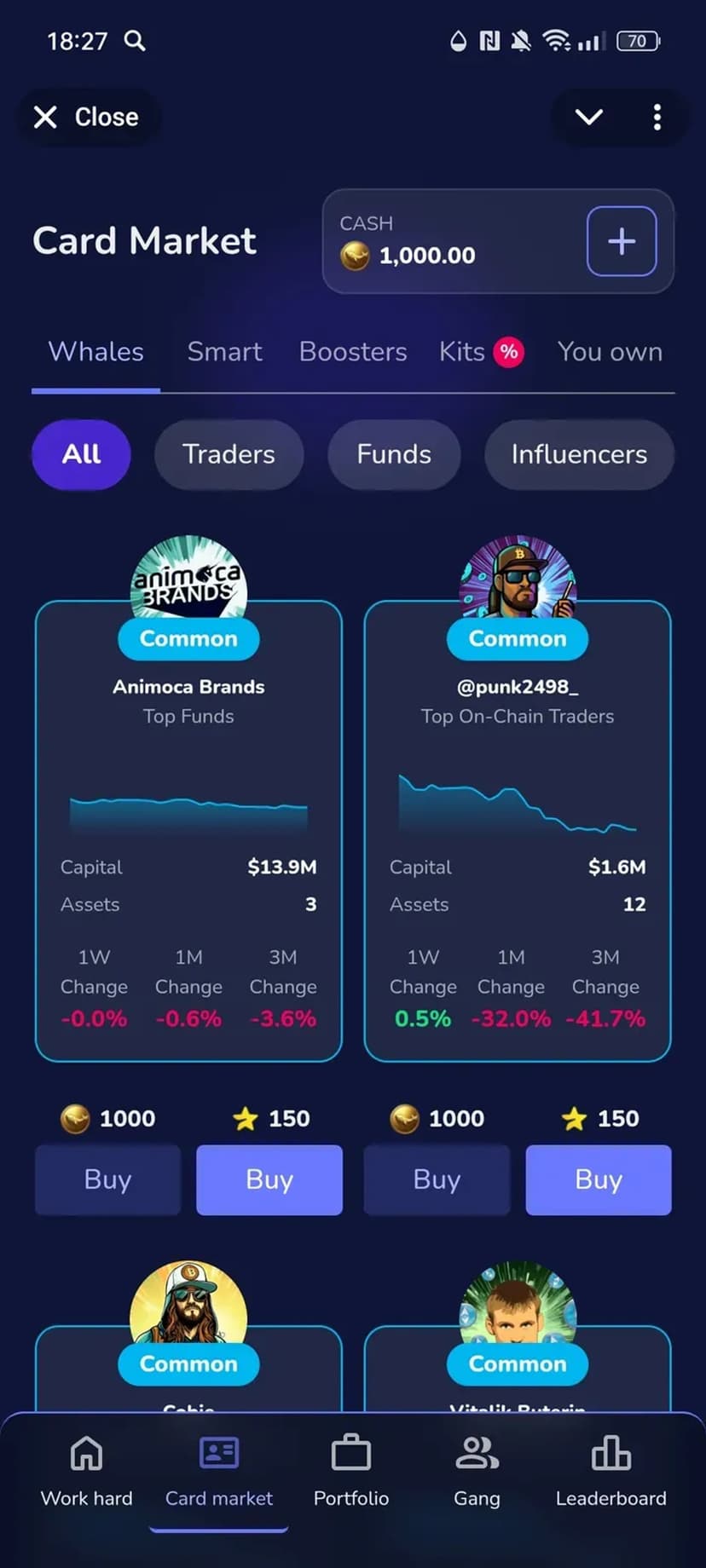 Коллекционируй карточки реальных криптоинвесторов, симулируй портфели и выполняй квесты