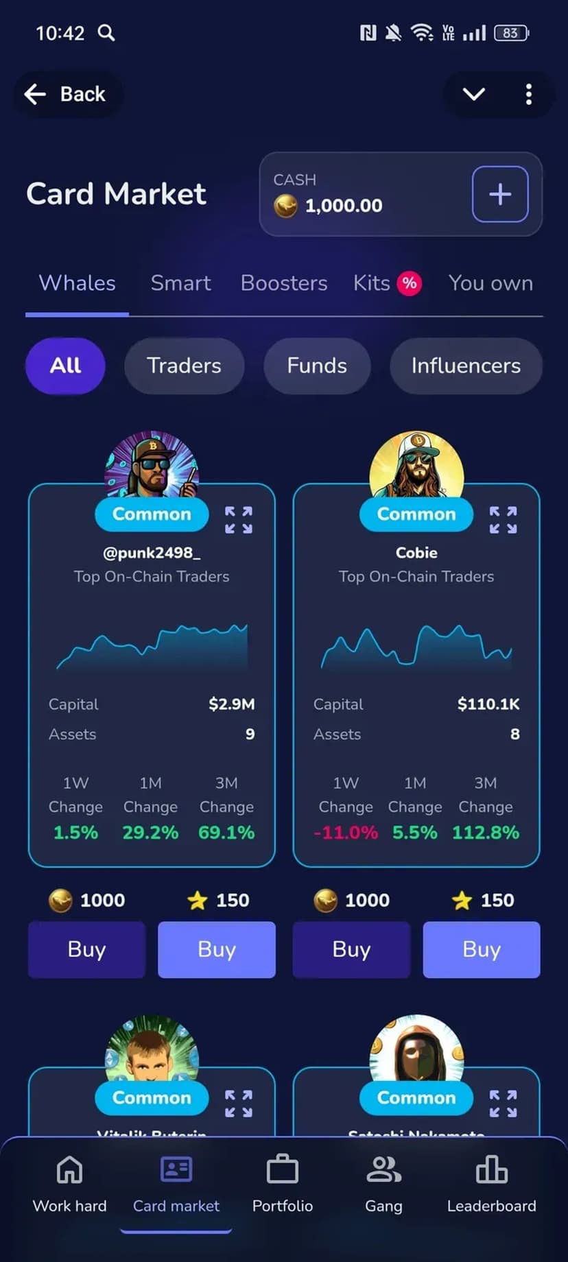 - Симуляция инвестиций через коллекционные карты, повторяющие составы реальных крипто-портфелей.