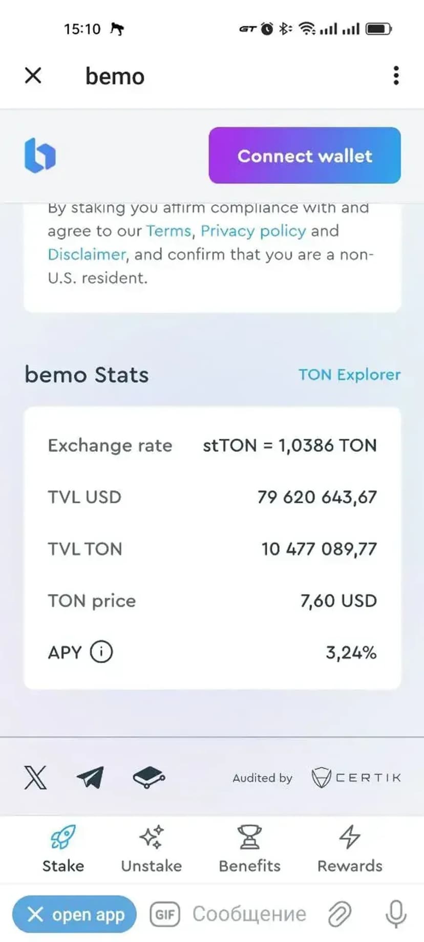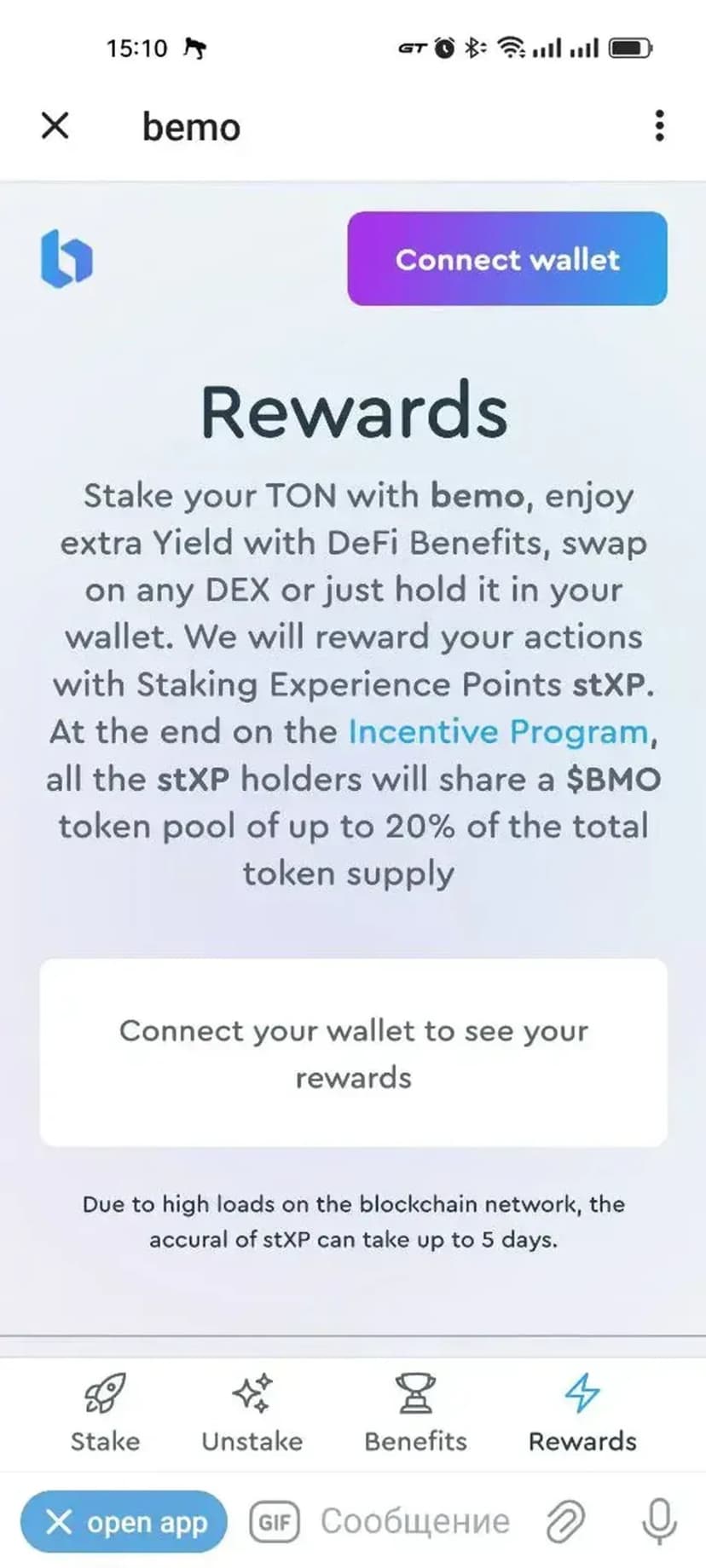 *Нажимая "Открыть в Telegram", вы перейдете к приложению bemo | TON Staking | Liquid Staking | bmTON в мессенджере Telegram