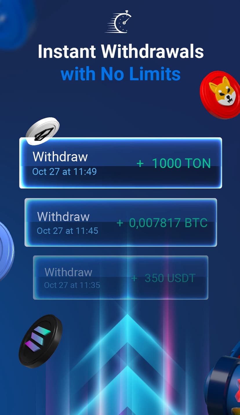 - Криптовалютные операции: быстрые депозиты и выводы, поддержка TONcoin и других криптовалют.