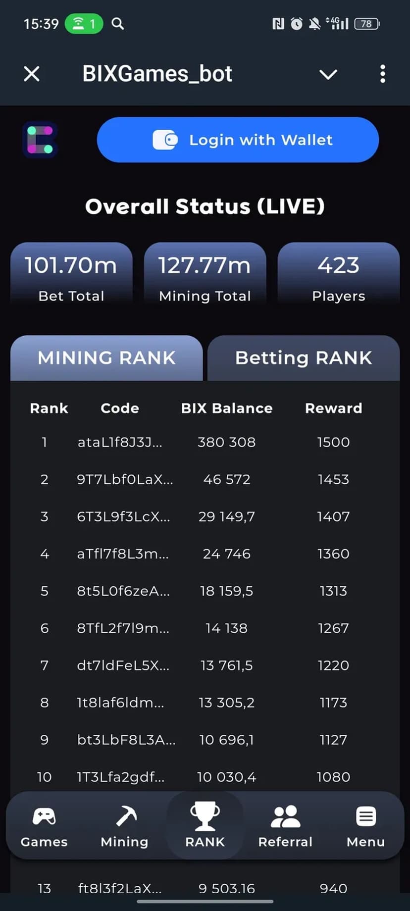 - Награды и выплаты: начисление BIX за активность и мгновенные выплаты выигрышей.