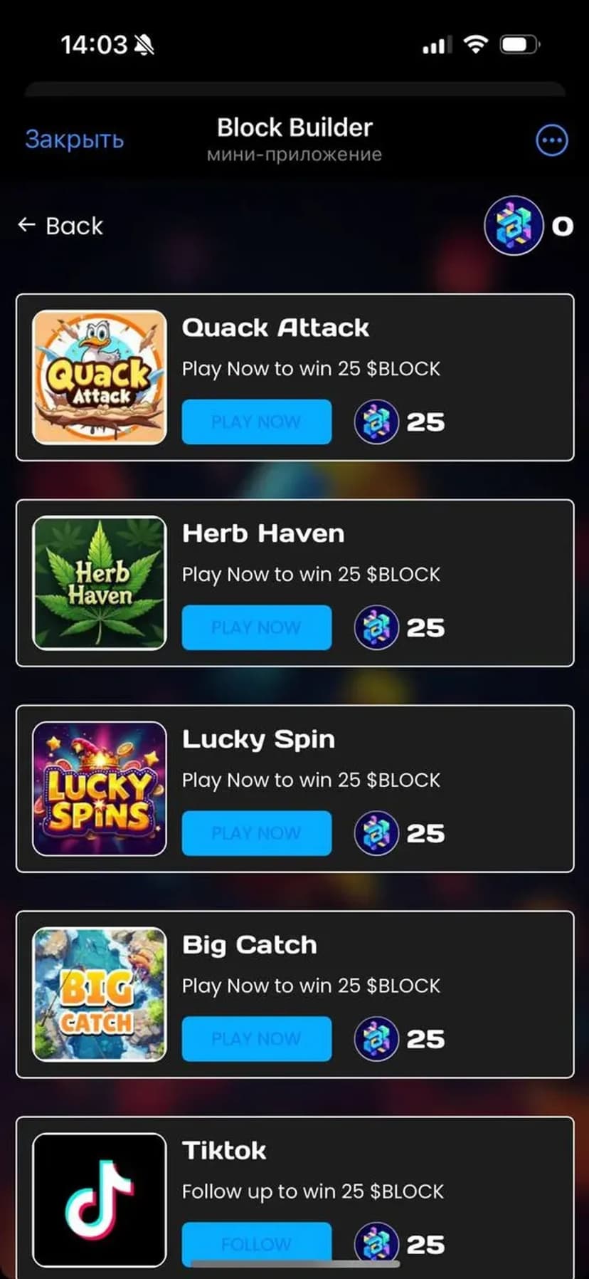 За выполнение задач вы получаете $BLOCK Coins, которые можно тратить на улучшение игровых способностей. Игра рассчитана на короткие игровые сессии и включает социальные элементы для соперничества с друзьями и отслеживания рекордов.