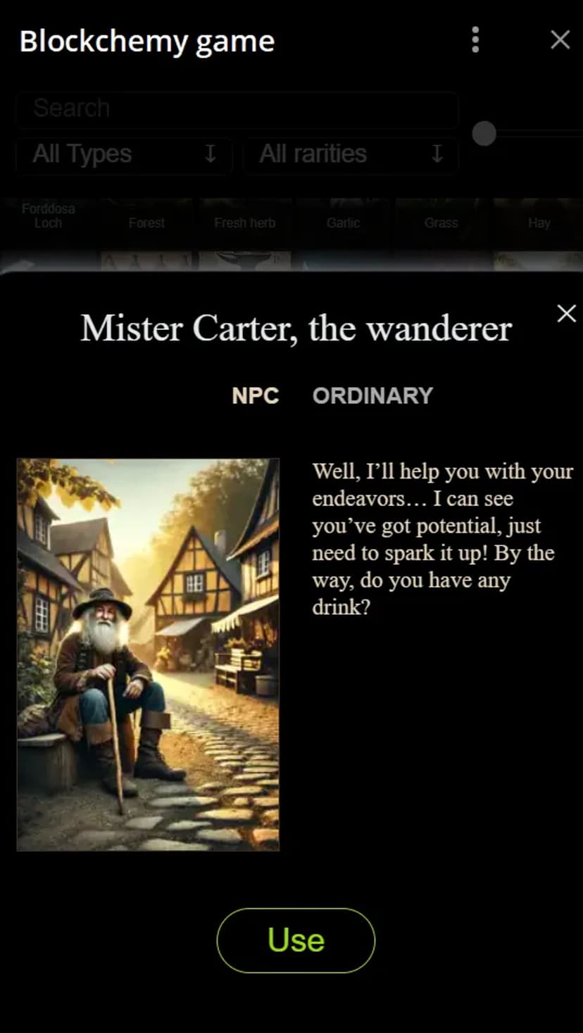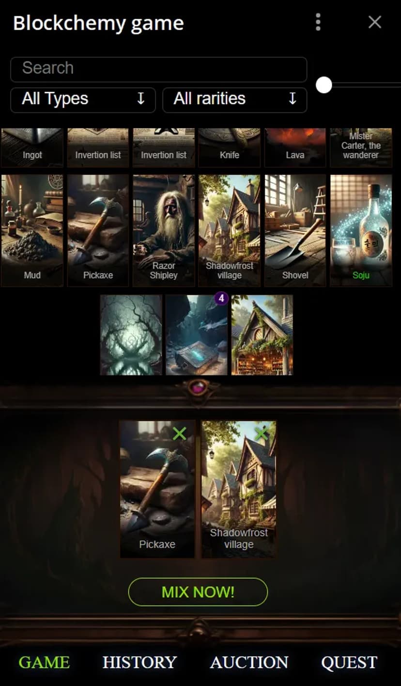 Blockchemy — мини-игра с алхимической тематикой, где сочетаны крафт предметов и внутриигровая экономика на блокчейне. Игроки исследуют сюжет, создают уникальные артефакты и обменивают коллекционные карточки на децентрализованном маркетплейсе.