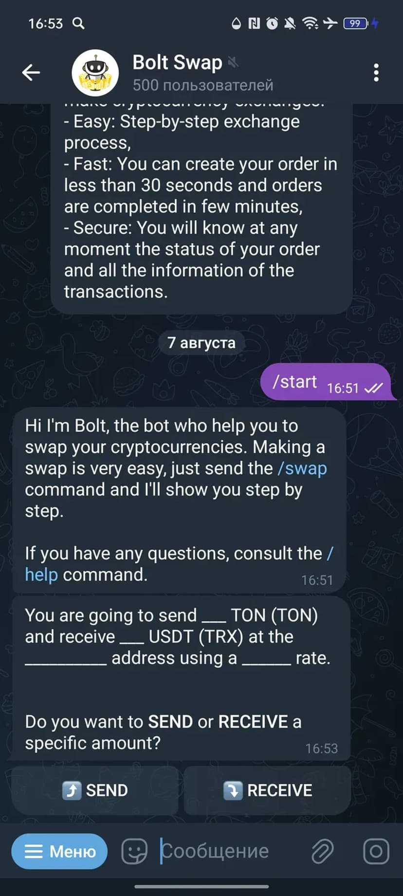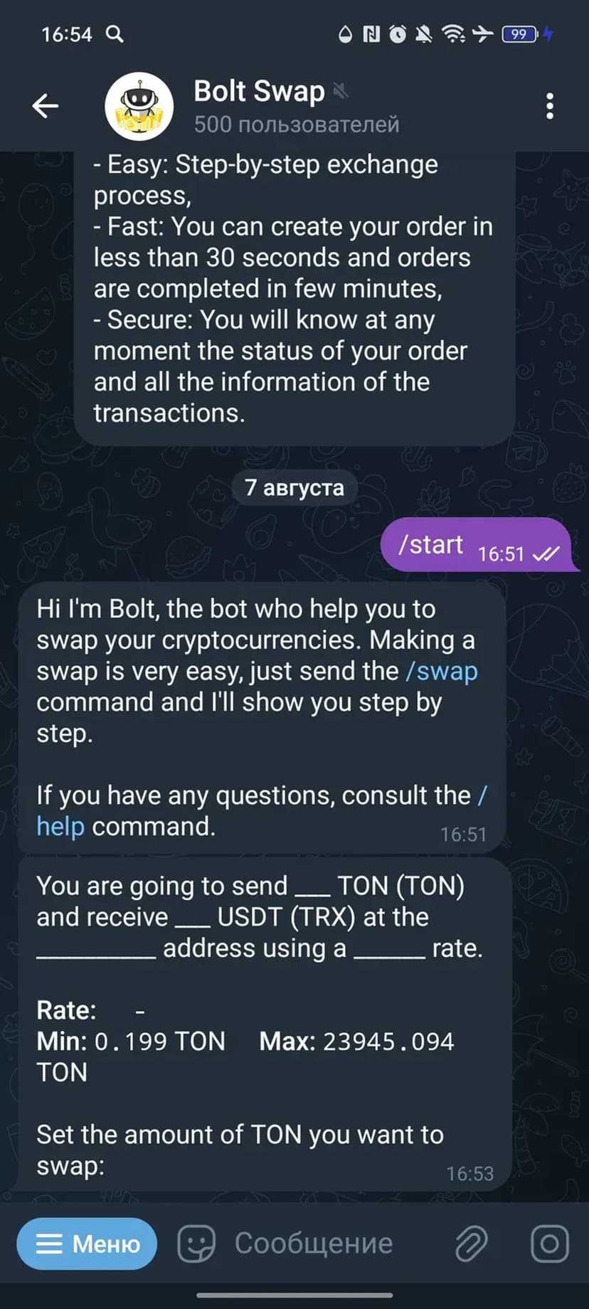 Bolt Swap — бот для быстрого и безопасного обмена криптовалют прямо в Telegram. Процесс организован пошагово: выбор валют и суммы, подтверждение операции и завершение транзакции без перехода на внешние площадки.