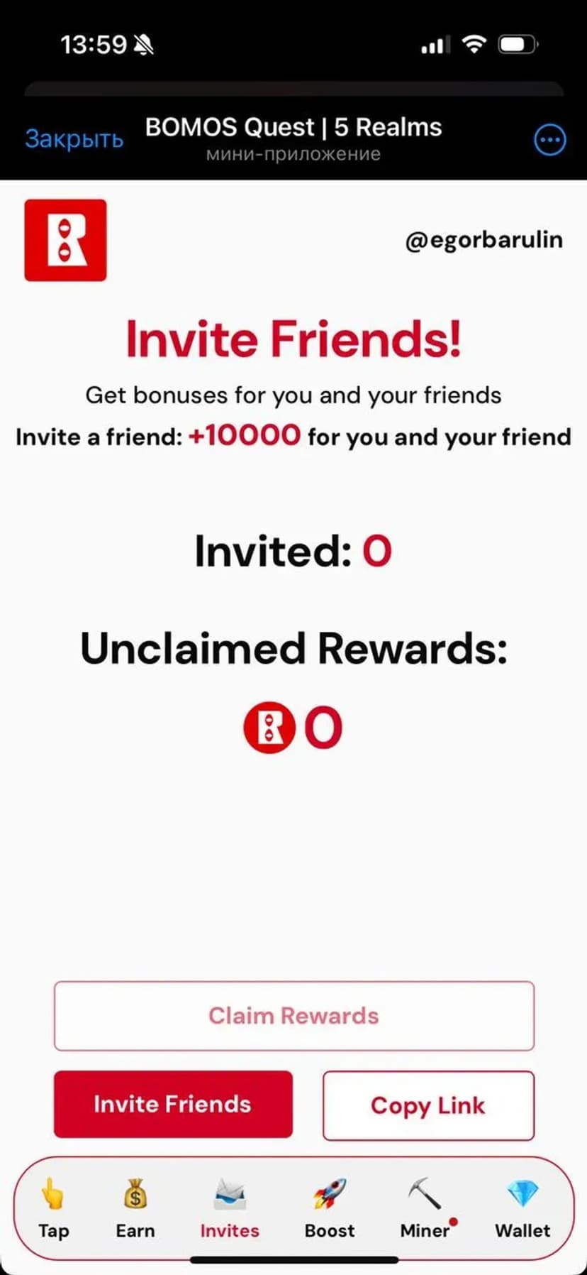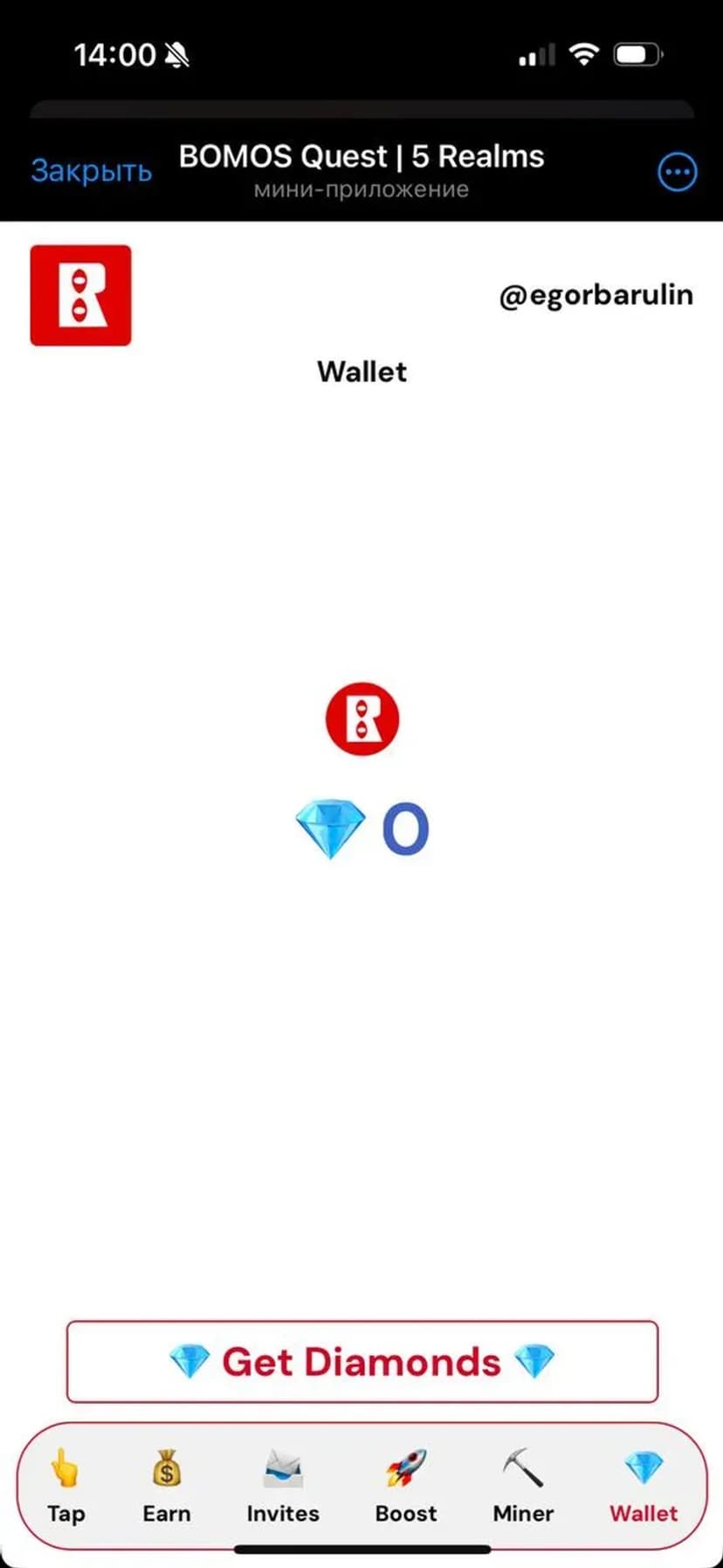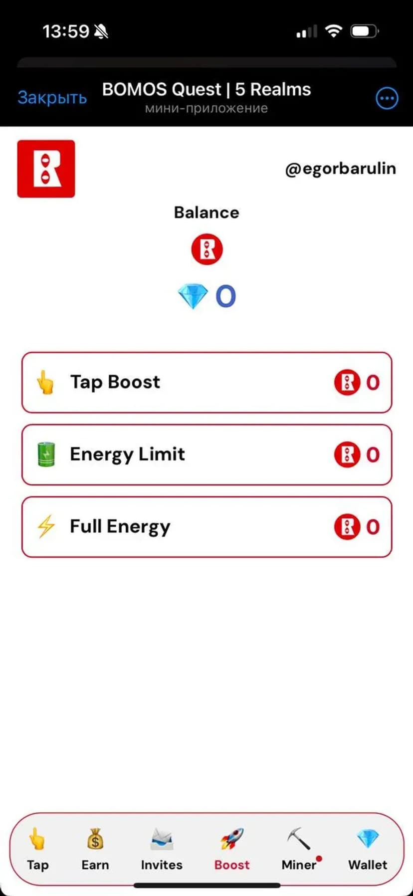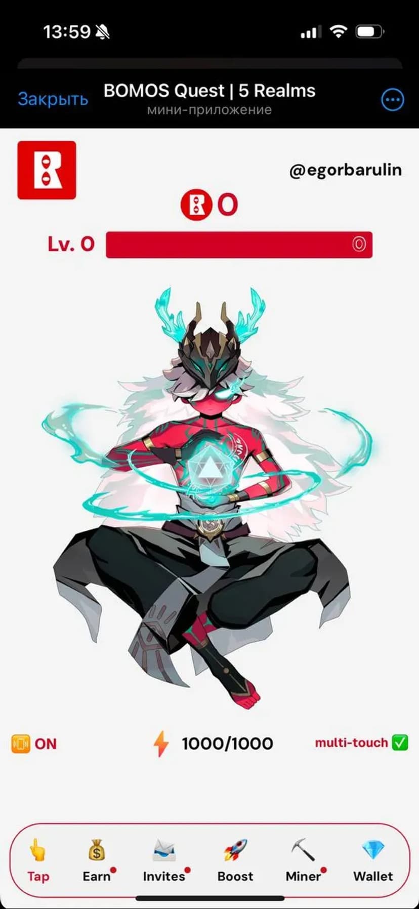 BOMOS Quest | 5 Realms — Tap to Earn-игра, где каждый тап приносит монеты и алмазы, которые можно конвертировать в валюту $RLM и использовать в экосистеме.