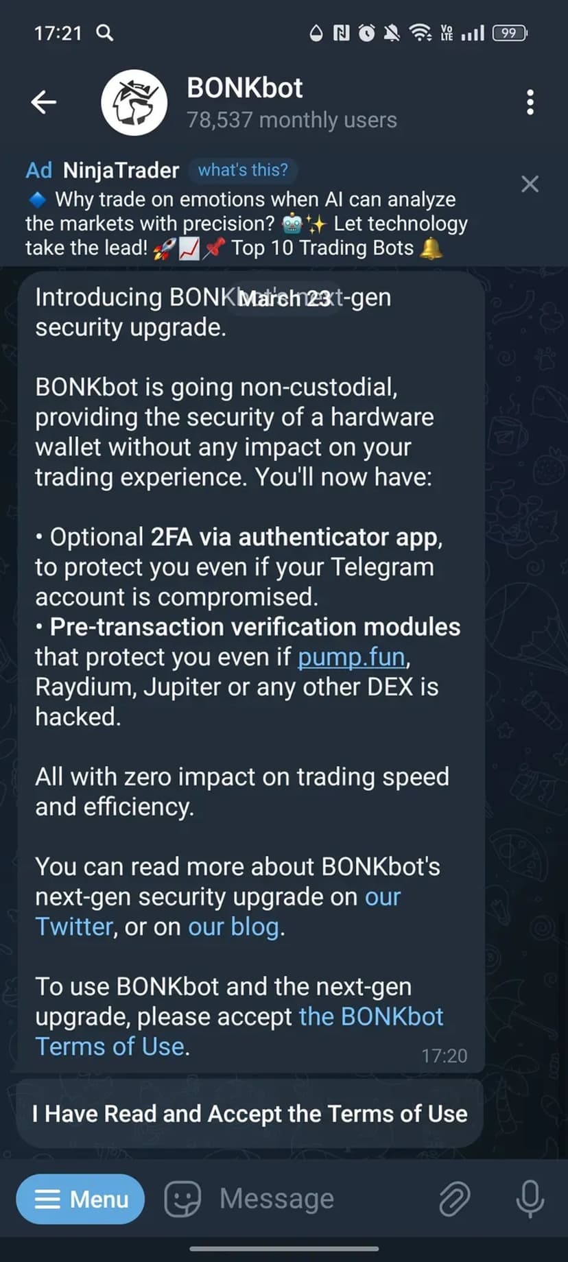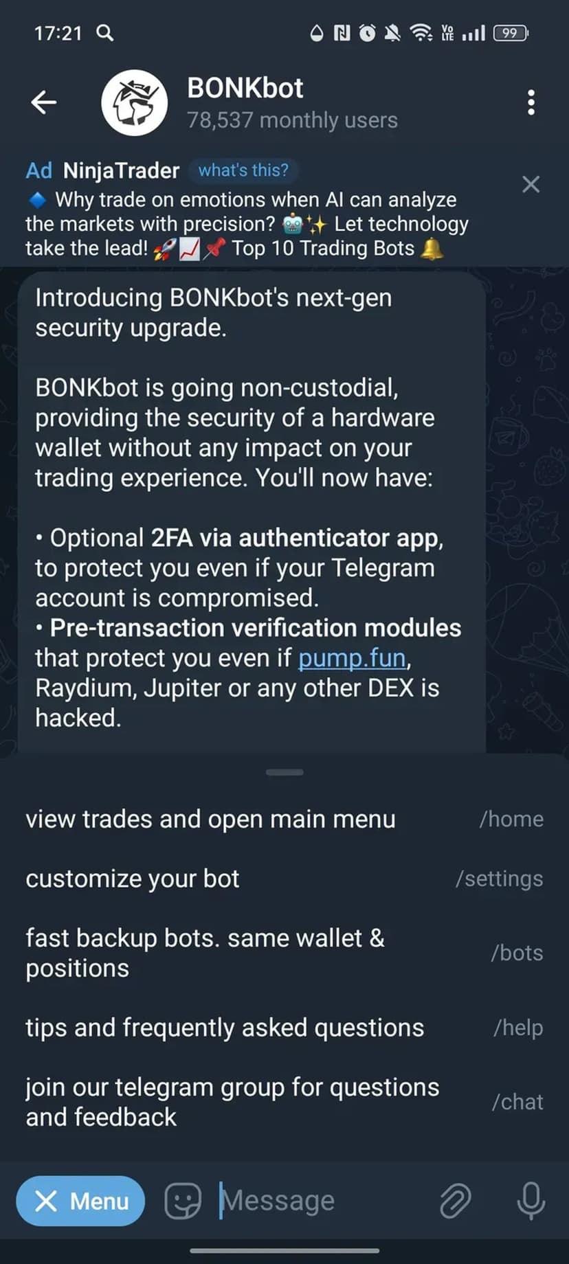 BONKbot предоставляет быстрый и простой доступ к торговле в экосистеме Solana через Telegram, сохраняя полный контроль над средствами пользователя за счёт некастодиального подхода.