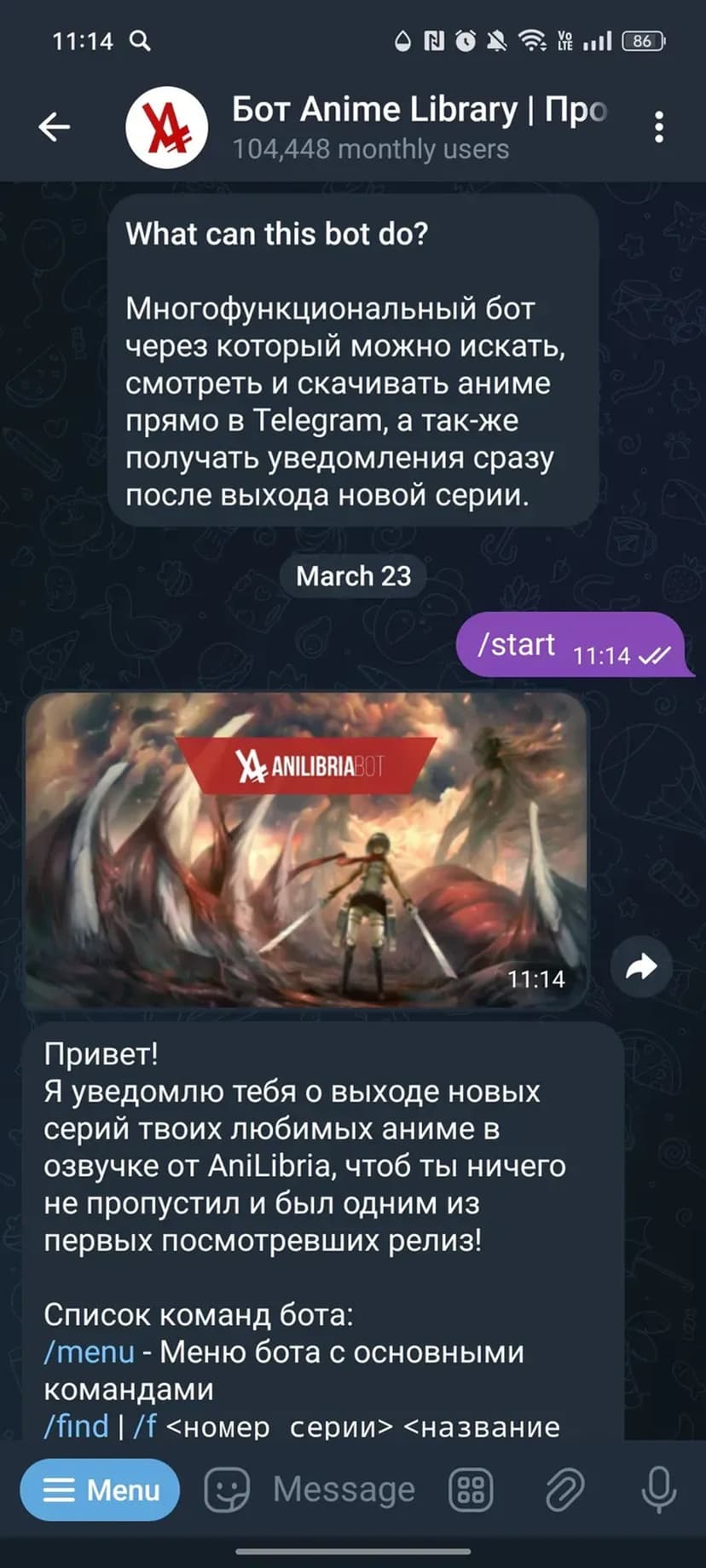 - Поиск, просмотр и скачивание аниме внутри мессенджера