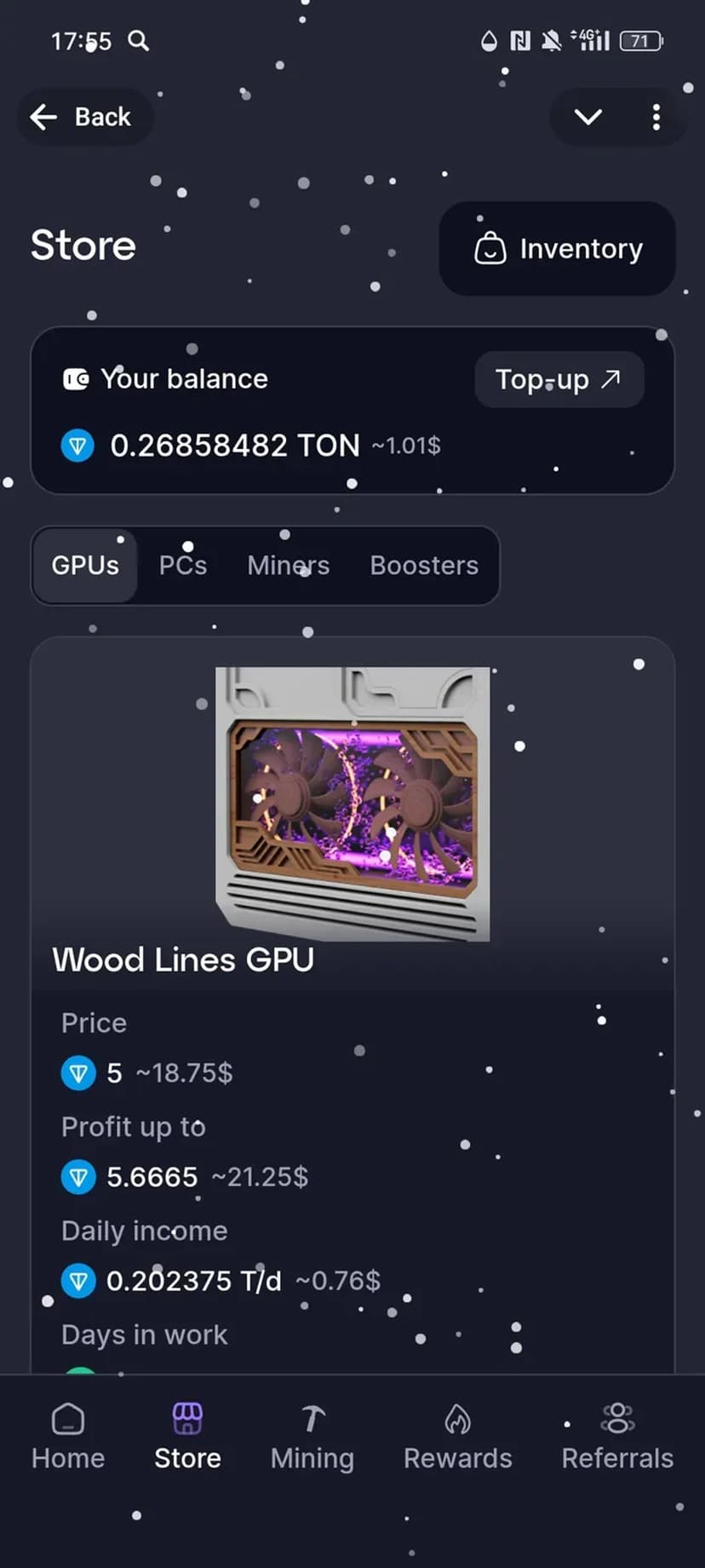 В приложении доступна инструкция и бесплатный стартовый майнер на три дня: за этот период можно получить до 0,5 TON без вложений — отличный способ проверить функционал.