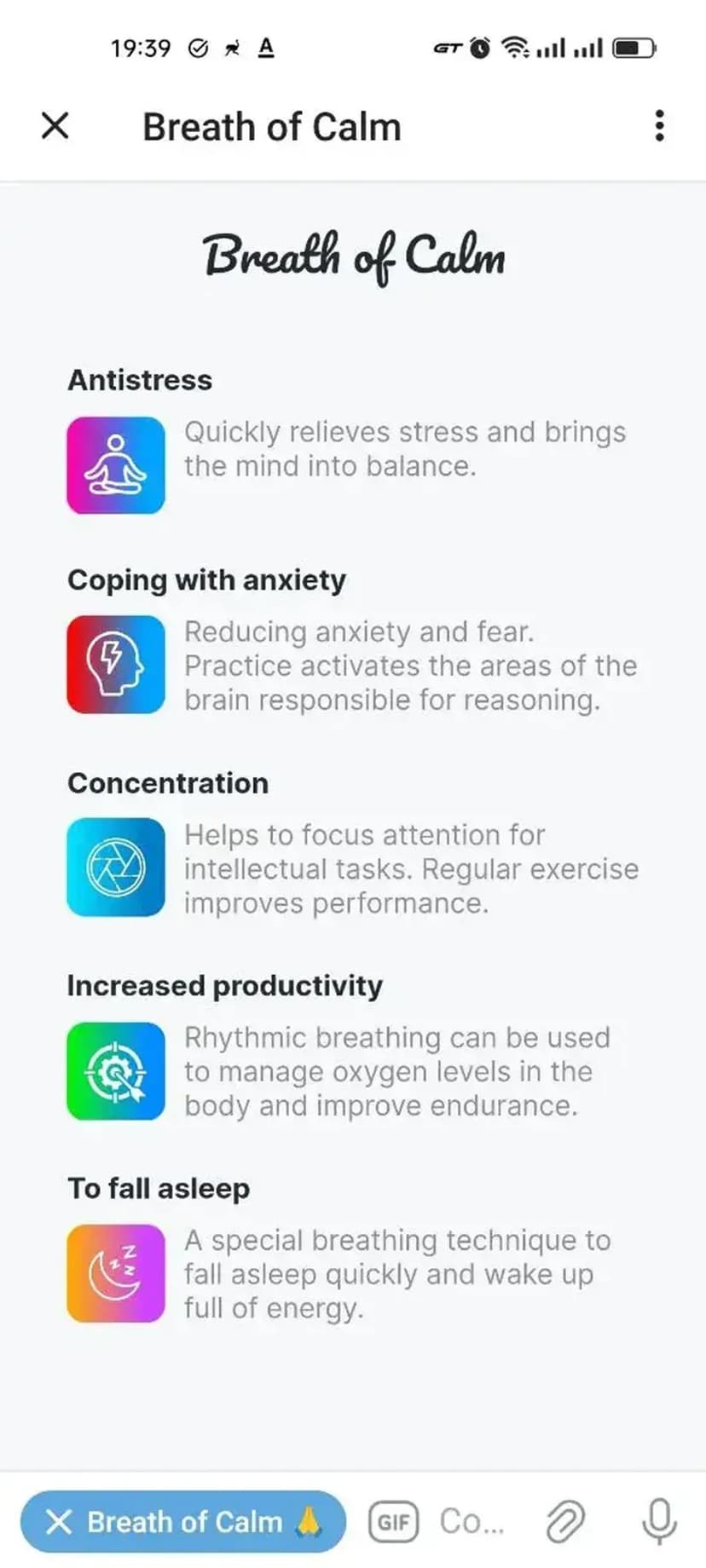 Breath of Calm помогает снимать стресс и тревожность, повышать концентрацию и подготовиться ко сну с помощью ритмичных дыхательных упражнений.