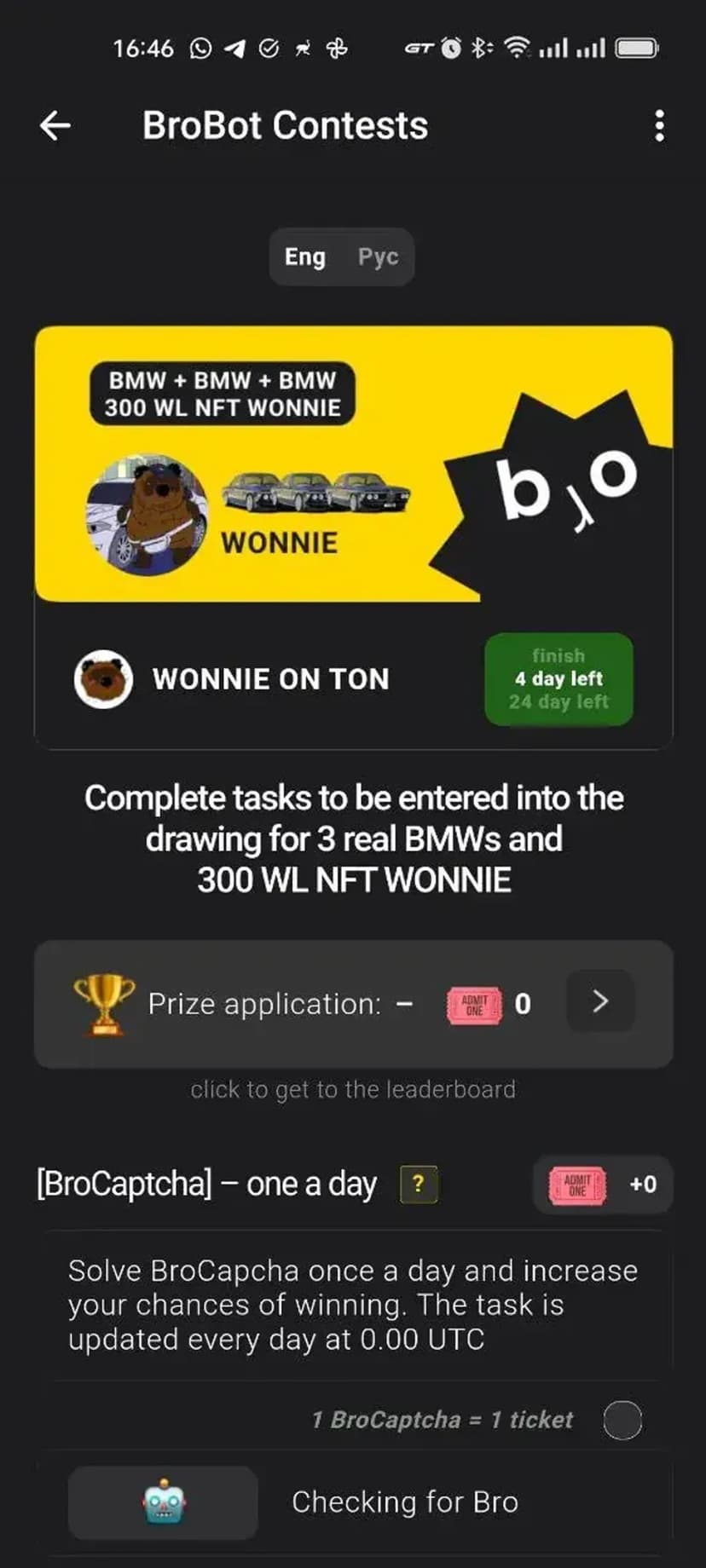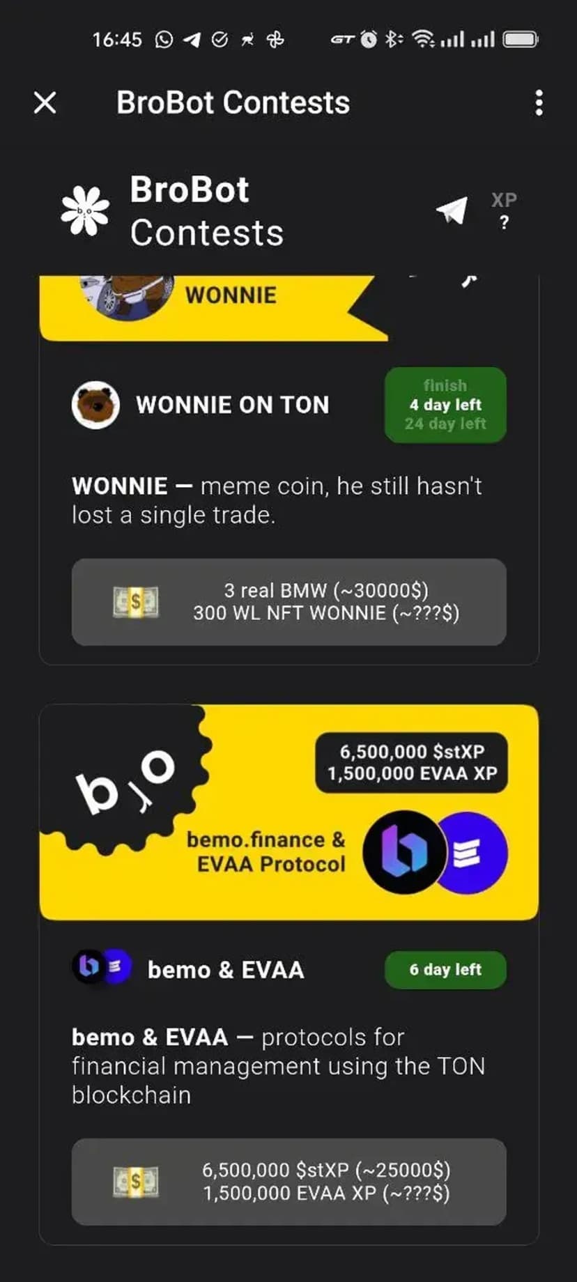 BroBot Contests позволяет принимать участие в конкурсах и активностях, связаных с экосистемой TON. Бот интегрируется с Telegram-аккаунтом и даёт доступ к заданиям, розыгрышам и интерактивным мероприятиям от организаторов.