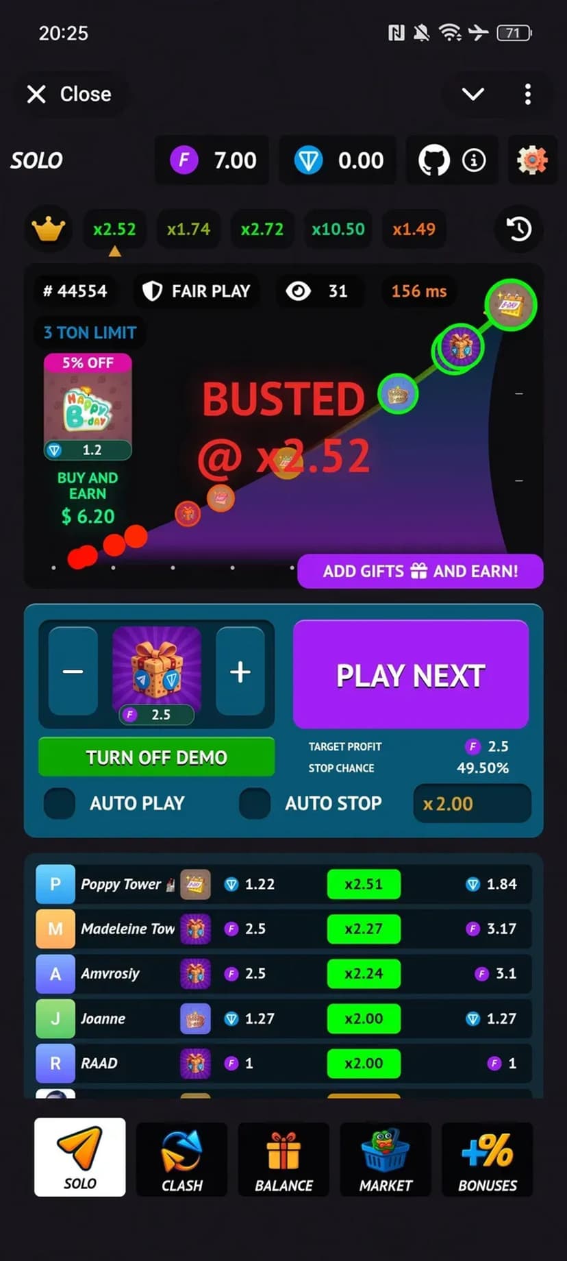 Bust'a Gift — PvP Battle Royale внутри Telegram: участники выбирают режим боя, вступают в сражения друг с другом, побеждают соперников и получают призы. Отдельная регистрация не требуется — игра запускается прямо в мессенджере.