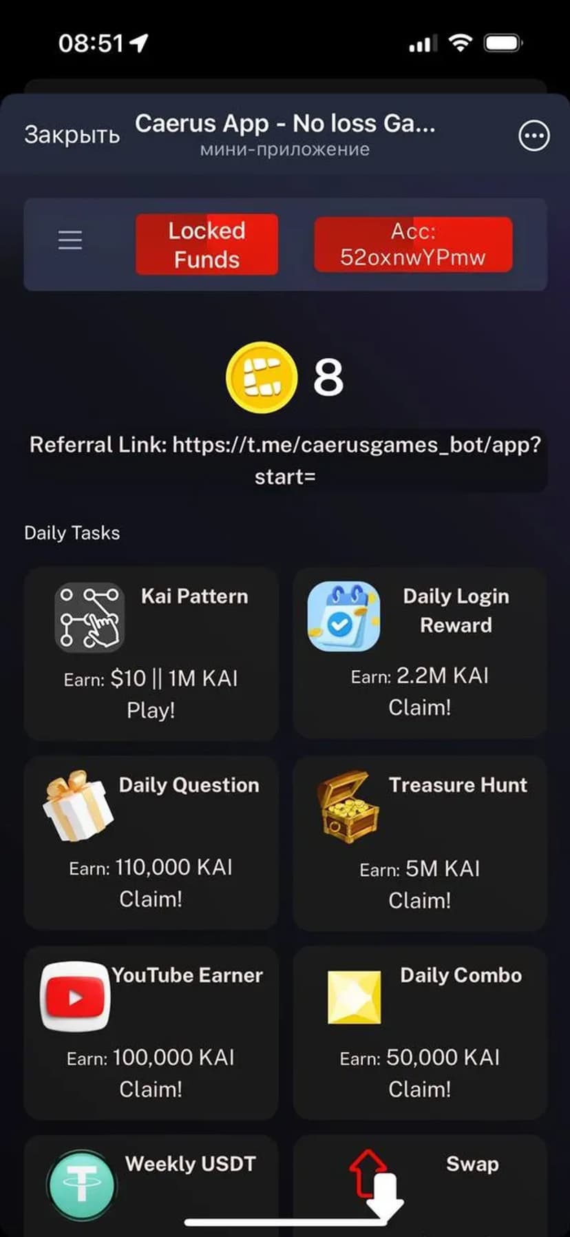 Caerus App — мини‑приложение, где игровые механики адаптированы для безрисового накопления токенов $KAI. Запускайте простые мини‑игры и получайте вознаграждения за активность; привлечение друзей увеличивает ваши доходы.