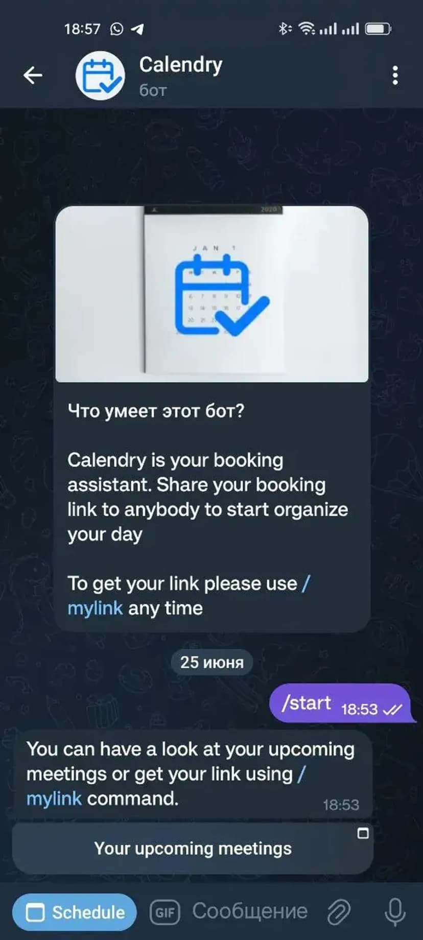 - Генерация ссылки: уникальная ссылка для бронирования, которую можно отправлять в чат, канал или личным сообщением.