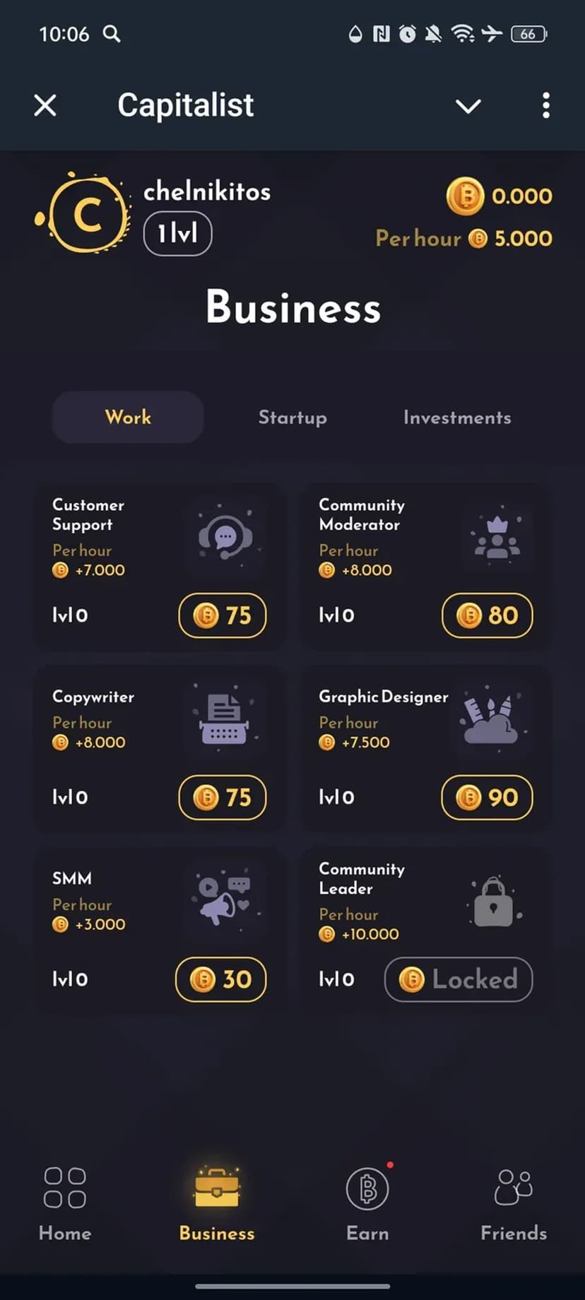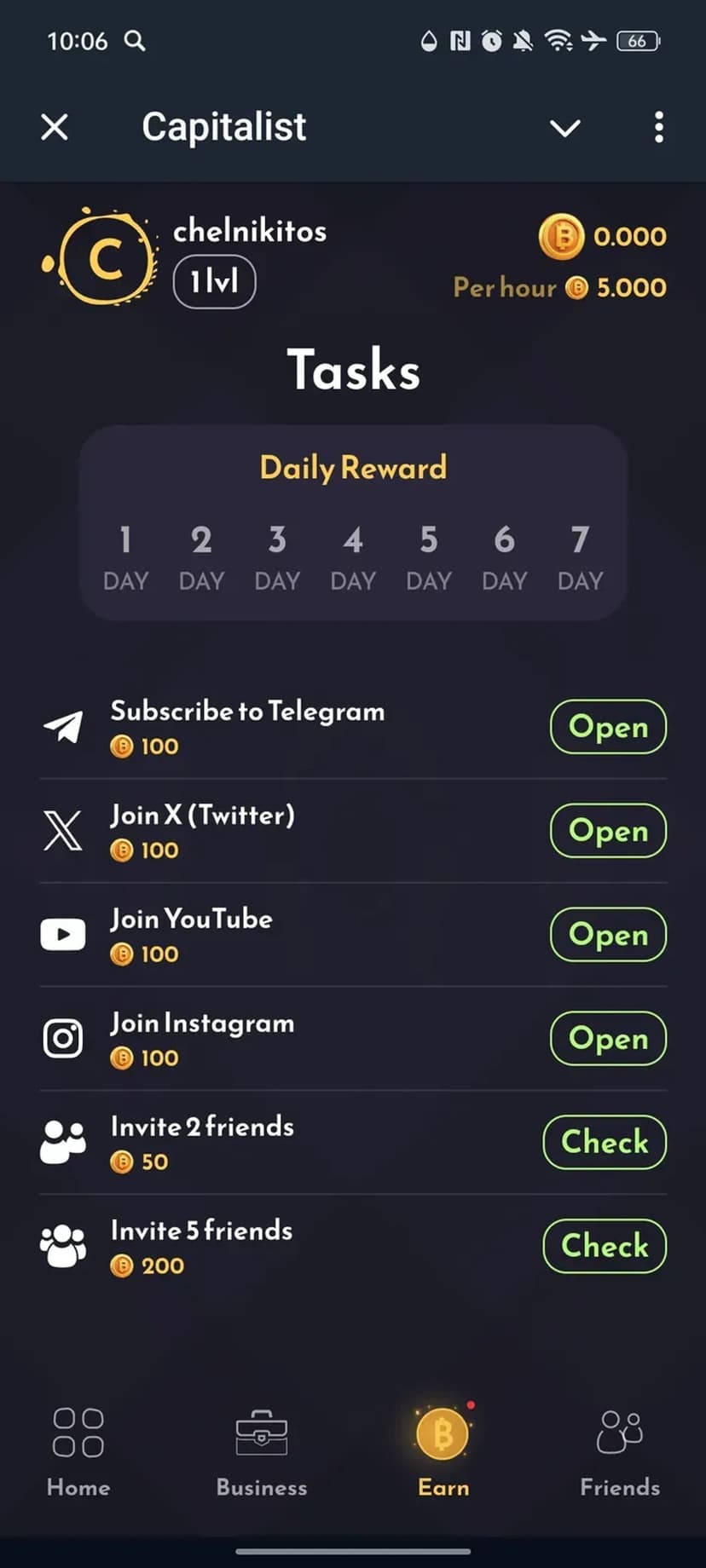 Capitalist — внутренняя экономическая игра в Telegram с социальными элементами: собирайте монеты, выполняйте задания и зарабатывайте внутриигровую валюту $BUCKS, повышая уровень персонажа.