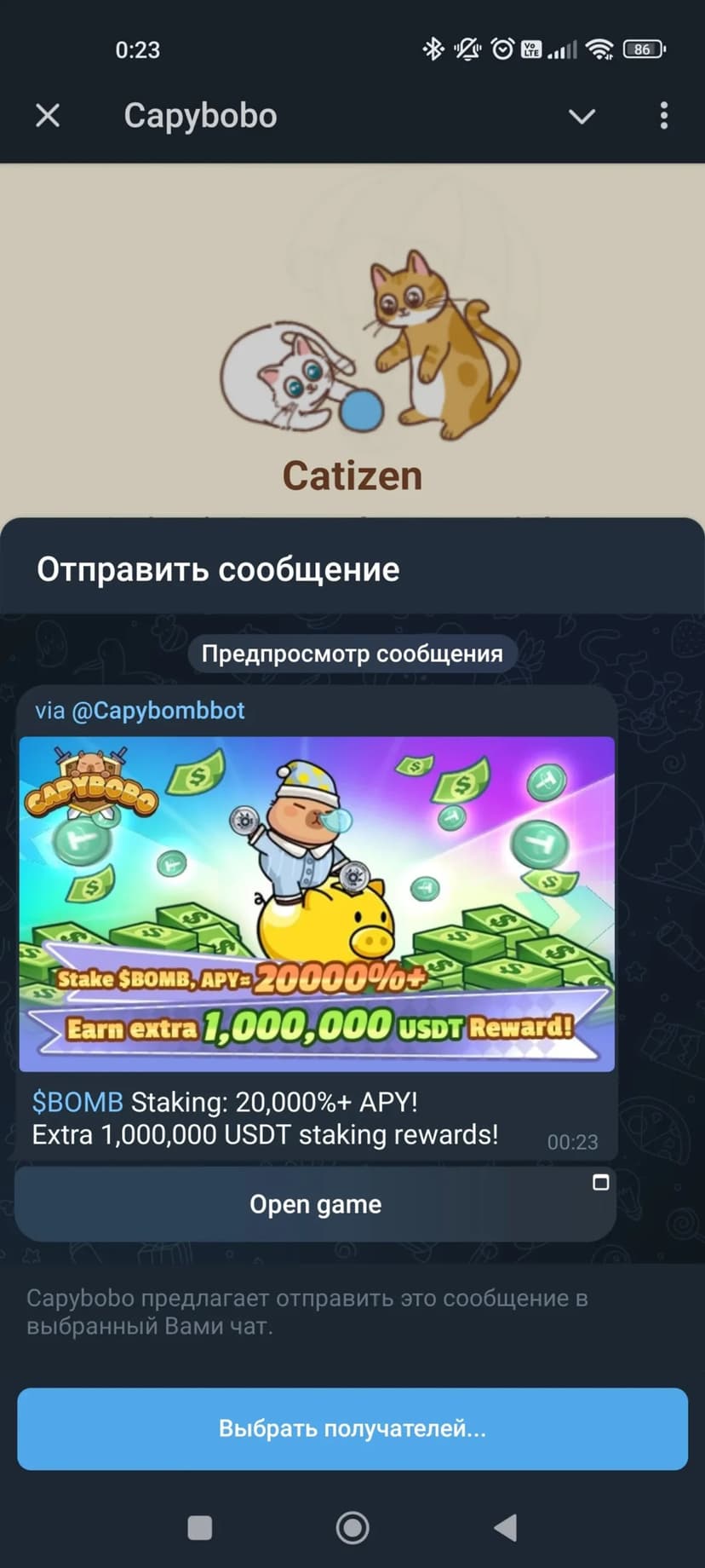 *Нажимая "Открыть в Telegram", вы перейдете к приложению Capybobo в мессенджере Telegram