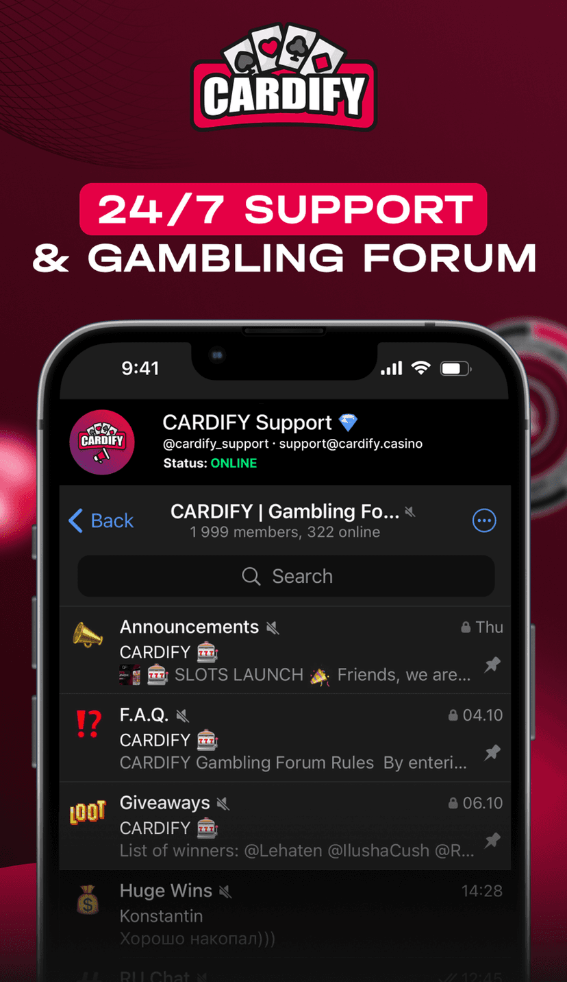 CARDIFY π° ΠΏΡΠ΅Π΄ΠΎΡΡΠ°Π²Π»ΡΠ΅Ρ Π΄ΠΎΡΡΡΠΏ ΠΊ ΠΏΠΎΠ»Π½ΠΎΡΡΠ½ΠΊΡΠΈΠΎΠ½Π°Π»ΡΠ½ΠΎΠΌΡ ΠΎΠ½Π»Π°ΠΉΠ½βΠΊΠ°Π·ΠΈΠ½ΠΎ Π²Π½ΡΡΡΠΈ Telegram: Π±ΠΎΠ»Π΅Π΅ 3000 Π»ΠΈΡΠ΅Π½Π·ΠΈΡΠΎΠ²Π°Π½Π½ΡΡ ΡΠ»ΠΎΡΠΎΠ² ΠΈ liveβΠΈΠ³Ρ, Π²ΠΊΠ»ΡΡΠ°Ρ ΡΡΠ»Π΅ΡΠΊΡ, ΠΏΠΎΠΊΠ΅Ρ ΠΈ Π±Π°ΠΊΠΊΠ°ΡΡ. ΠΠ»Π°ΡΡΠΎΡΠΌΠ° Π΄Π΅ΠΌΠΎΠ½ΡΡΡΠΈΡΡΠ΅Ρ ΡΡΠ΅Π΄Π½ΠΈΠΉ ΠΏΠΎΠΊΠ°Π·Π°ΡΠ΅Π»Ρ RTP ΠΎΠΊΠΎΠ»ΠΎ 96,5%.