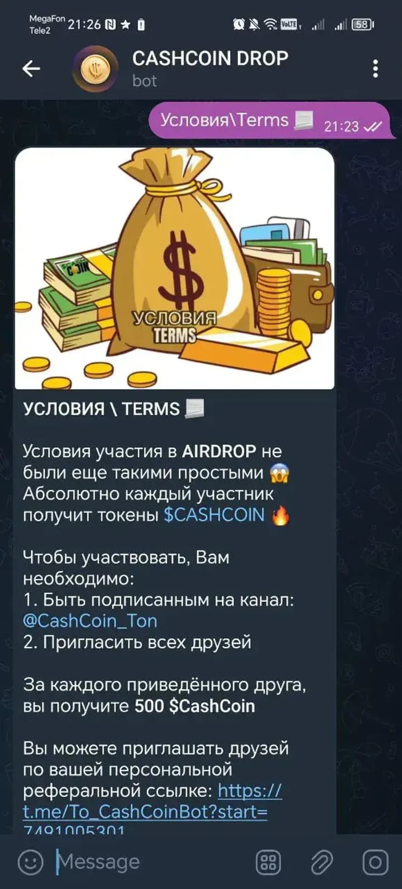 Аирдроп $CashCoin: начисление токенов за подписки, рефералов и учёт баланса