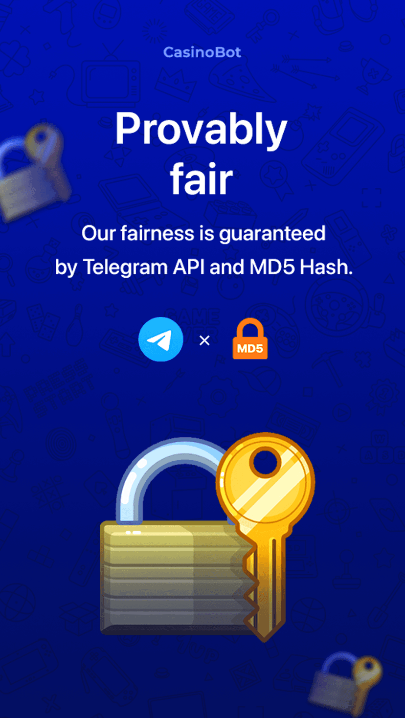 Авторизация проходит через Telegram‑аккаунт; для проведения транзакций требуется адрес TON‑кошелька. В отдельных играх результаты формируются с использованием Telegram API или через MD5‑хеши, что позволяет проверять честность исходов.