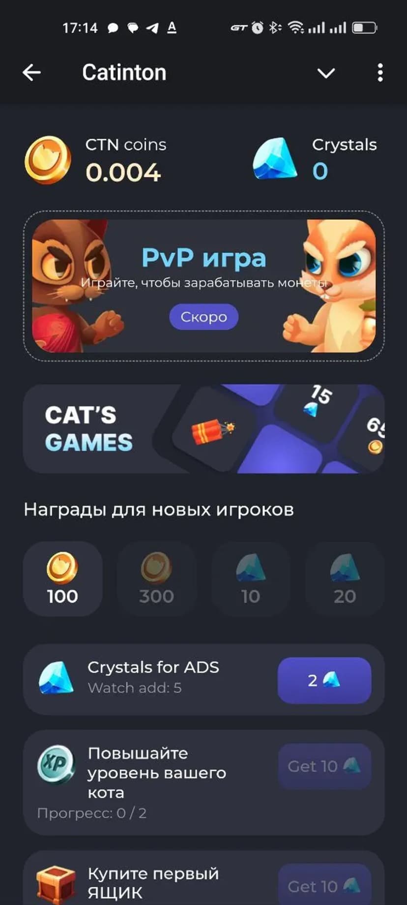 Catinton — аркадная мини‑игра, где вы управляете виртуальным котом, собирающим монеты CTN. Задача — повысить эффективность добычи за счёт прокачки персонажа и использования предметов из инвентаря.