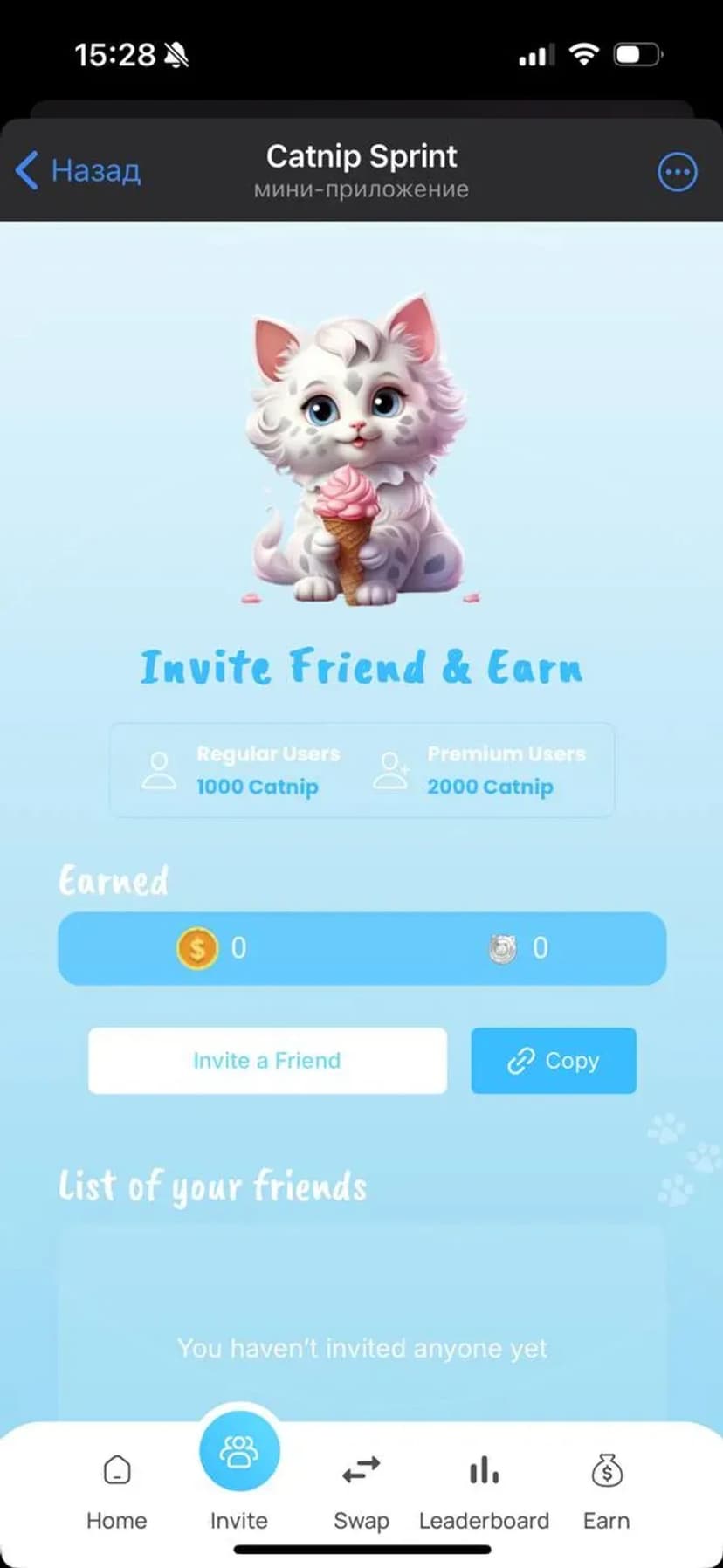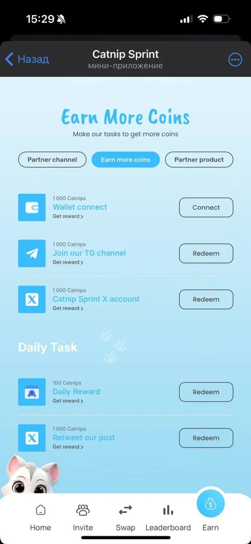 Кликер: нажимай Catnip, копи очки и обменивай их на USDT через токены