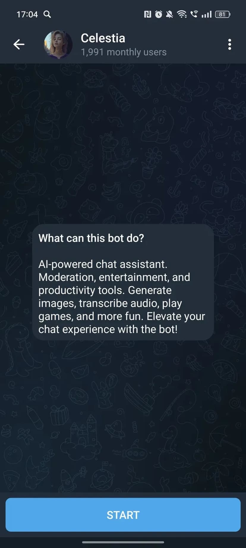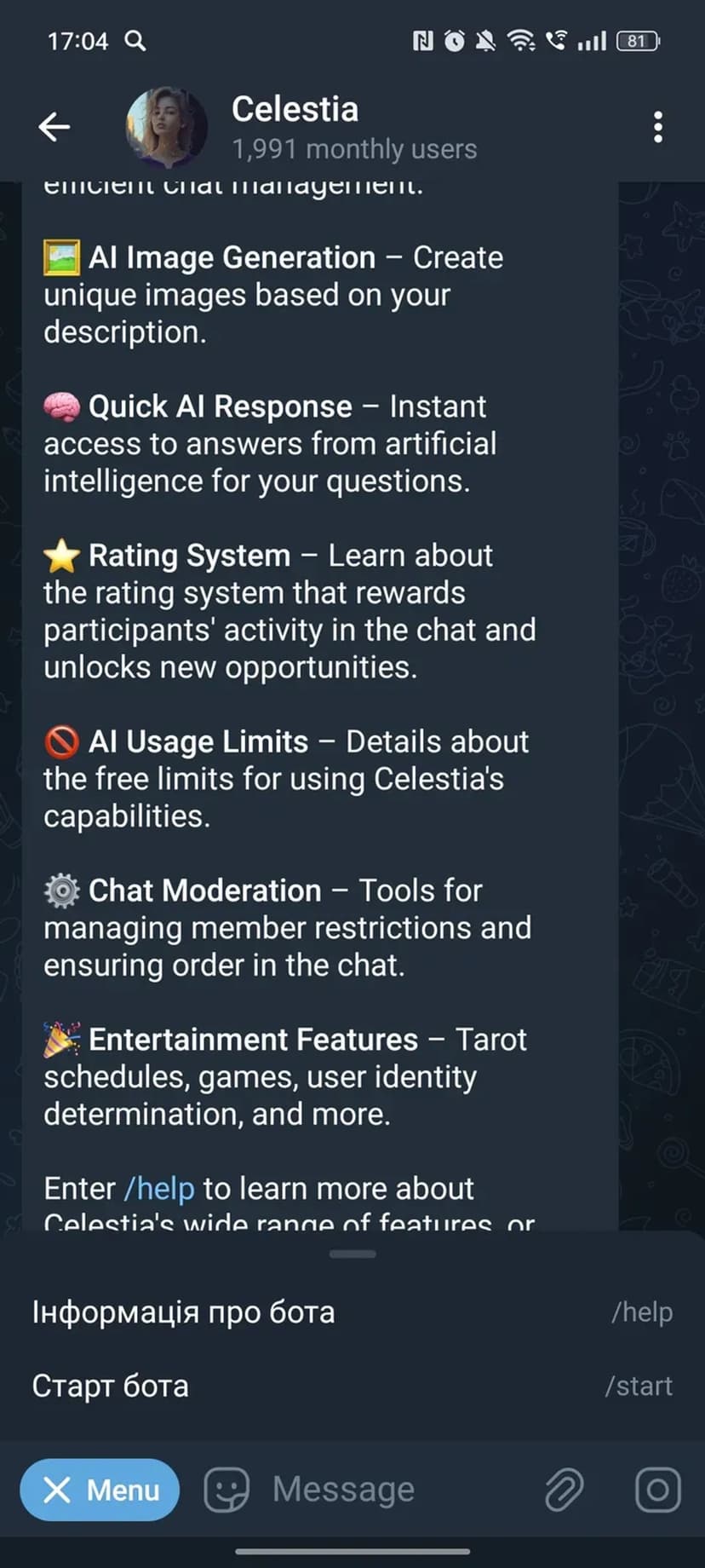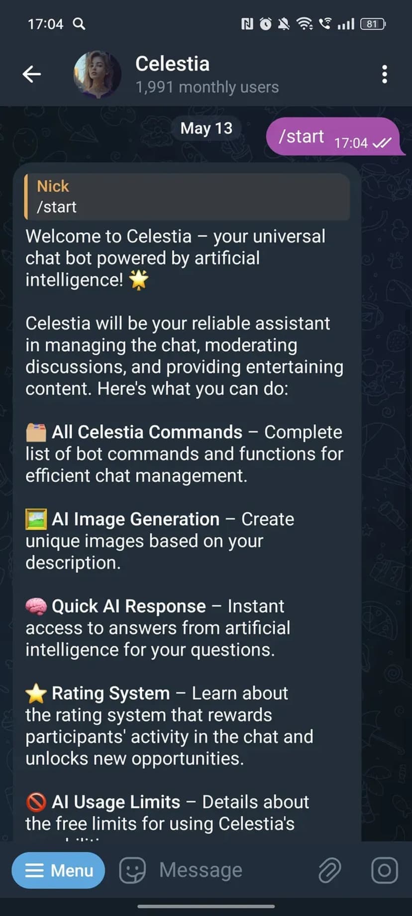Celestia — универсальный AI‑бот в Telegram, объединяющий инструменты для модерации, развлечений и повышения эффективности общения в группах и командах.