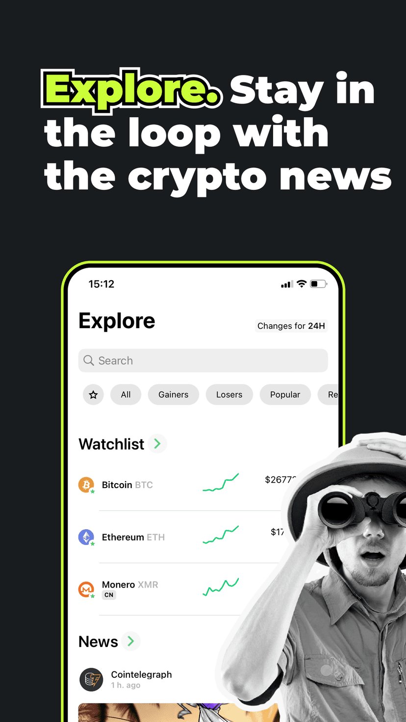 - Лента новостей о рынке и быстрый доступ к избранным монетам