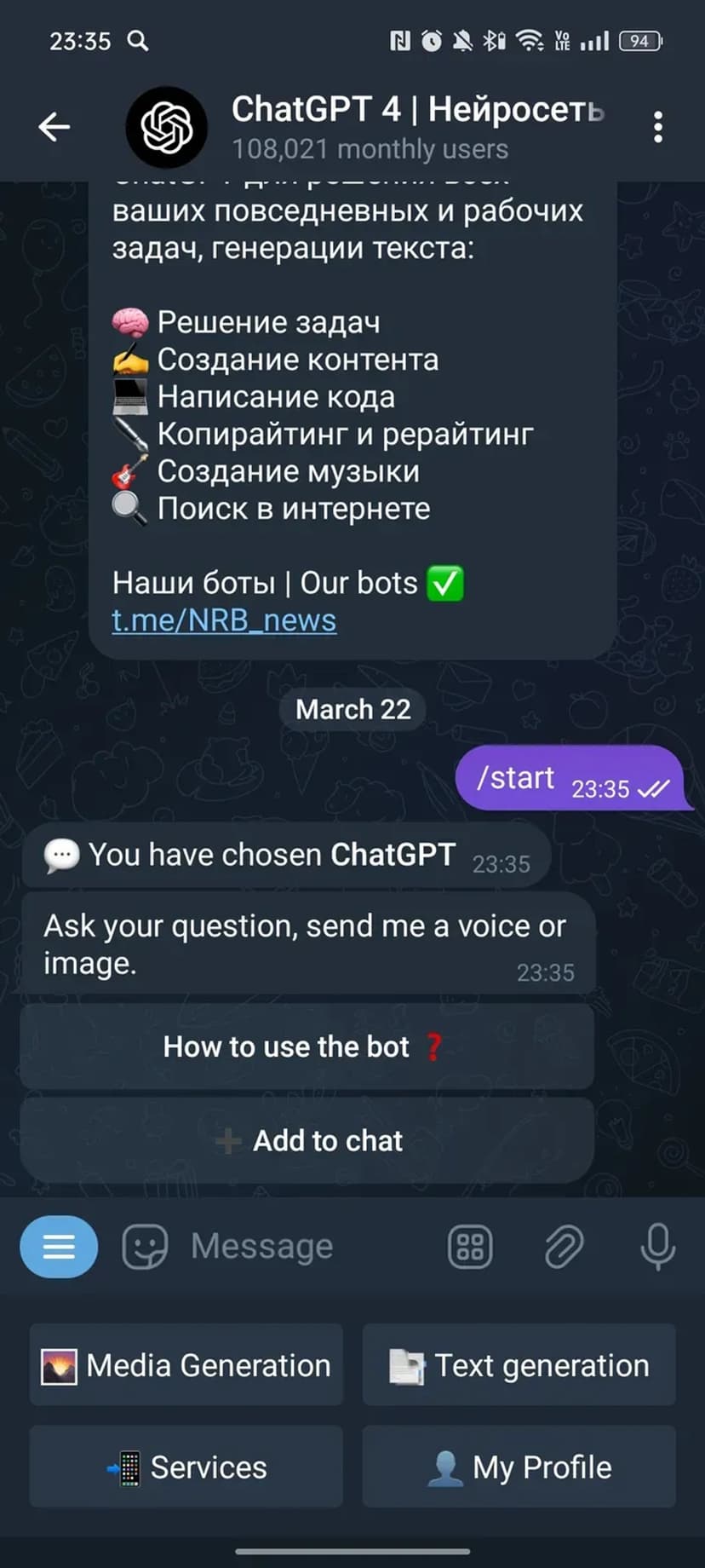 ChatGPT AI Gemini Claude Suno — многофункциональный бот в Telegram, объединяющий диалоговые нейросети, генерацию изображений и работу с голосовыми сообщениями. Пользователь может отправлять текст, голос или изображение прямо в чат и получать быстрый ответ или обработанный контент на базе современных языковых и мультимедийных моделей.