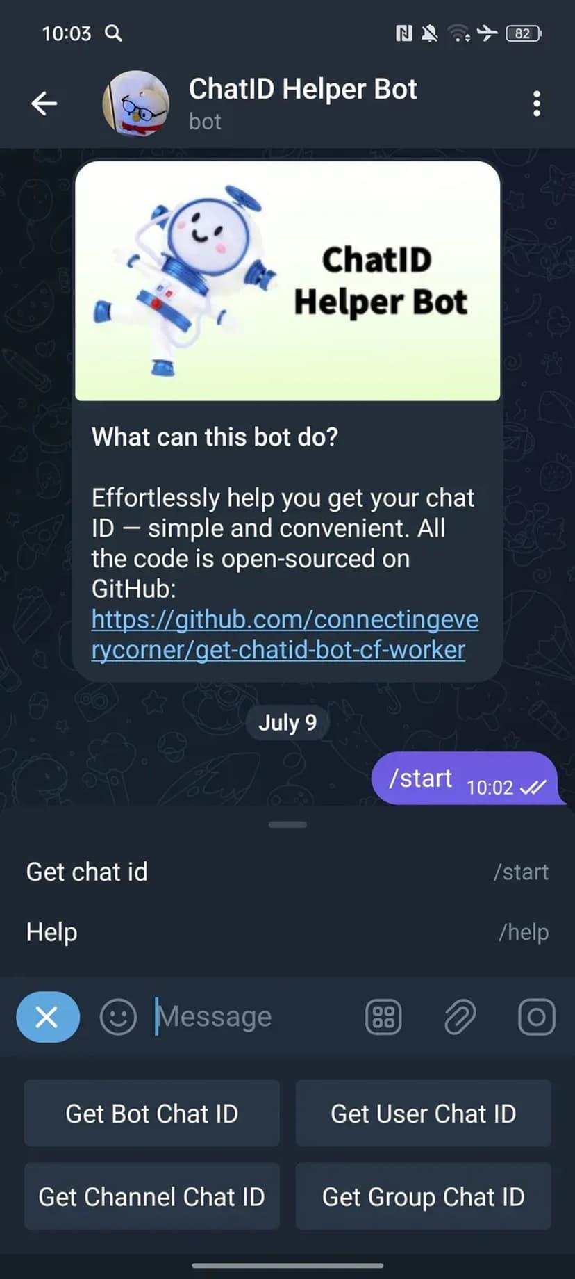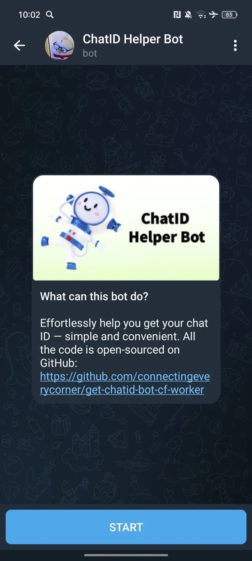 ChatID Helper Bot — лёгкий и понятный инструмент для получения числового идентификатора чата (chat ID) в Telegram. Подходит разработчикам, администраторам ботов и владельцам каналов при настройке интеграций, отправке уведомлений и работе с API Telegram.